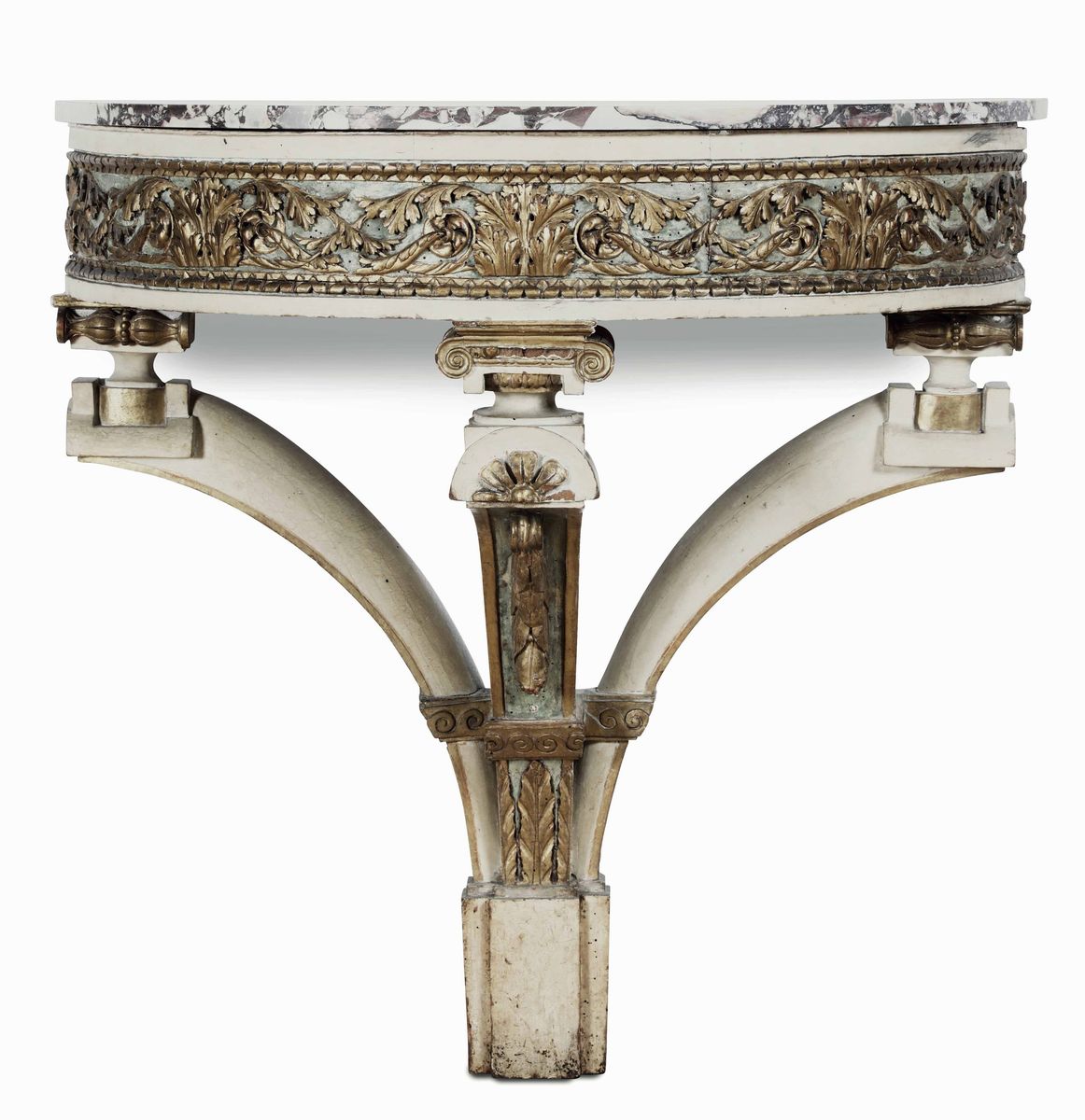Consolle a goccia in legno intagliato, laccato e dorato, fine XVIII secolo