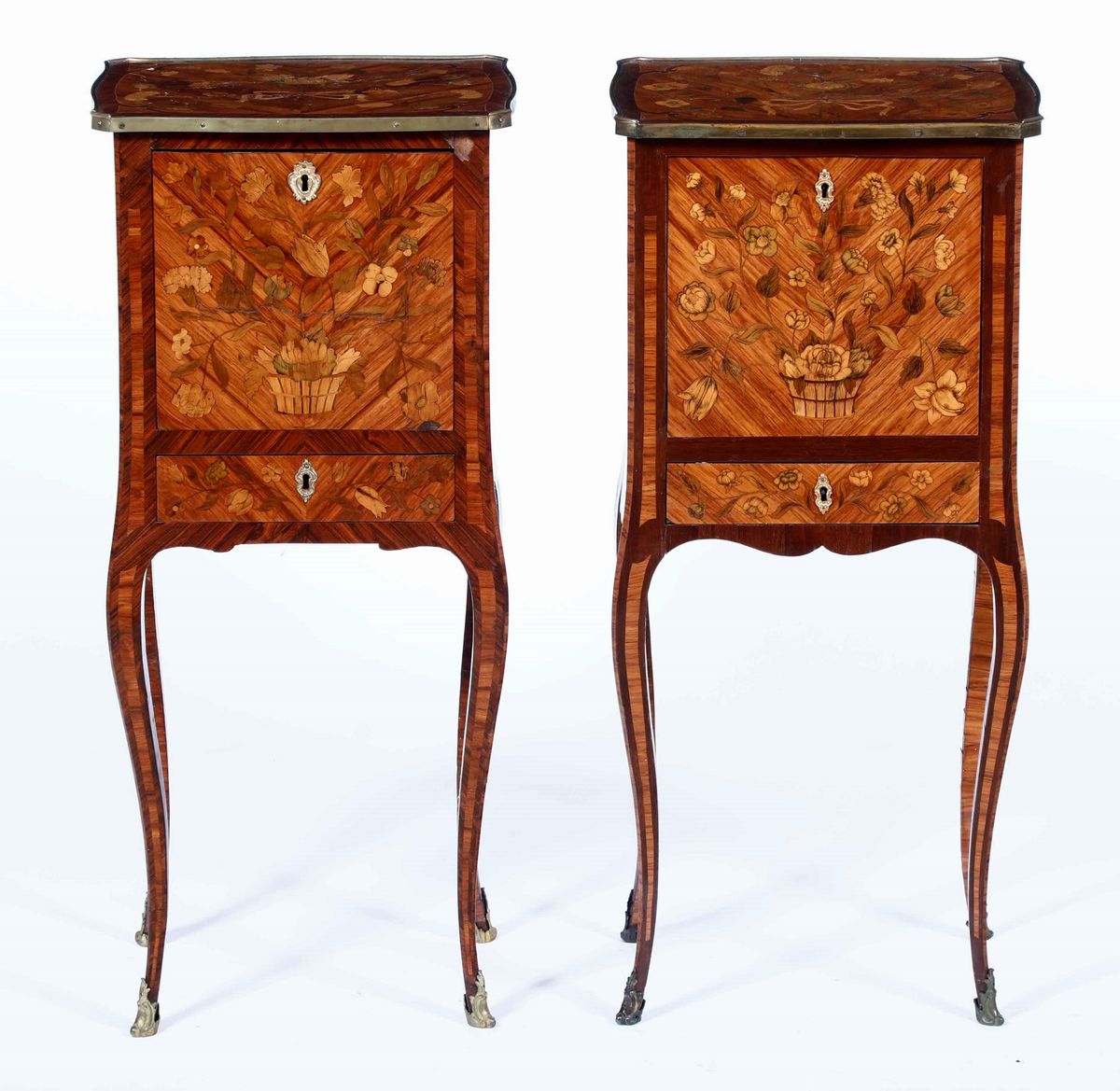 Coppia di comodini in legno lastronato ed intarsiato. Francia XVIII-XIX secolo
