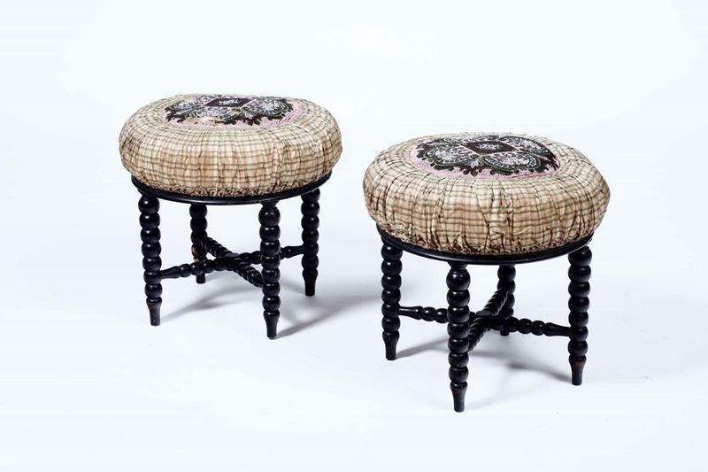 Coppia di poltrone a rocchetto in legno ebanizzato, XIX-XX secolo