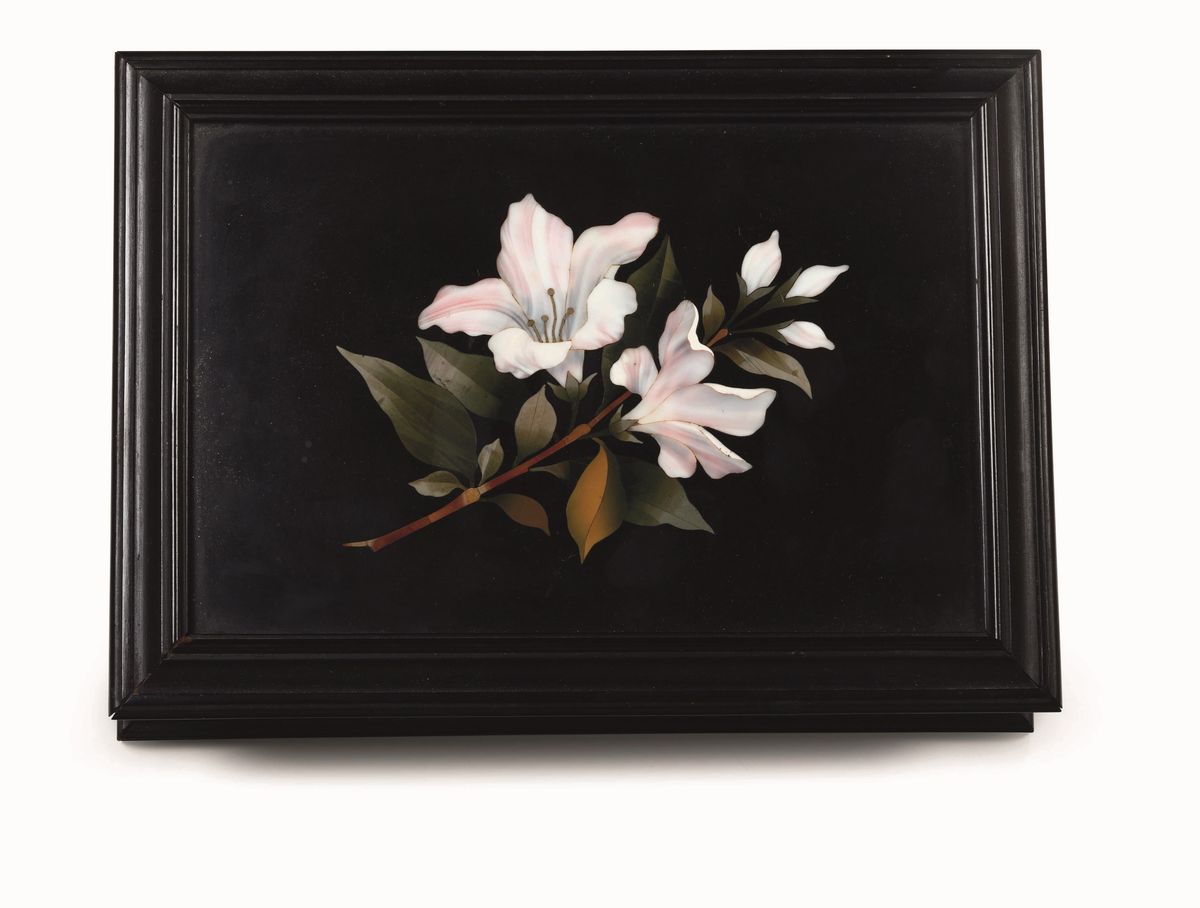 Scatola con coperchio intarsiato con pietre dure a motivo floreale. Manifattura fiorentina XIX-XX secolo