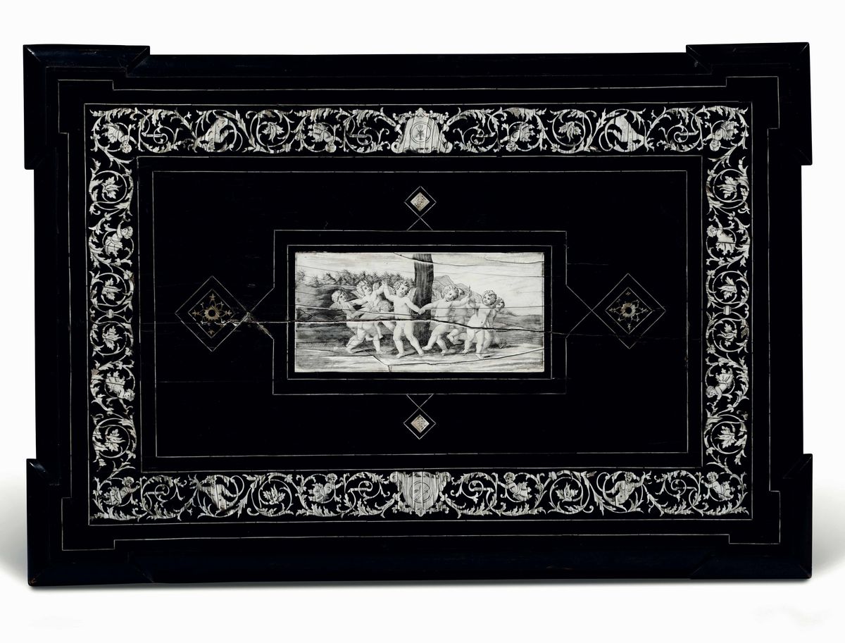 stampigliato sul bordo del cassetto. Al centro del piano placca in avorio con motivo di amorini danzanti e fascia esterna con decoro di girali e figure fantastiche centrate da riserve con stemma