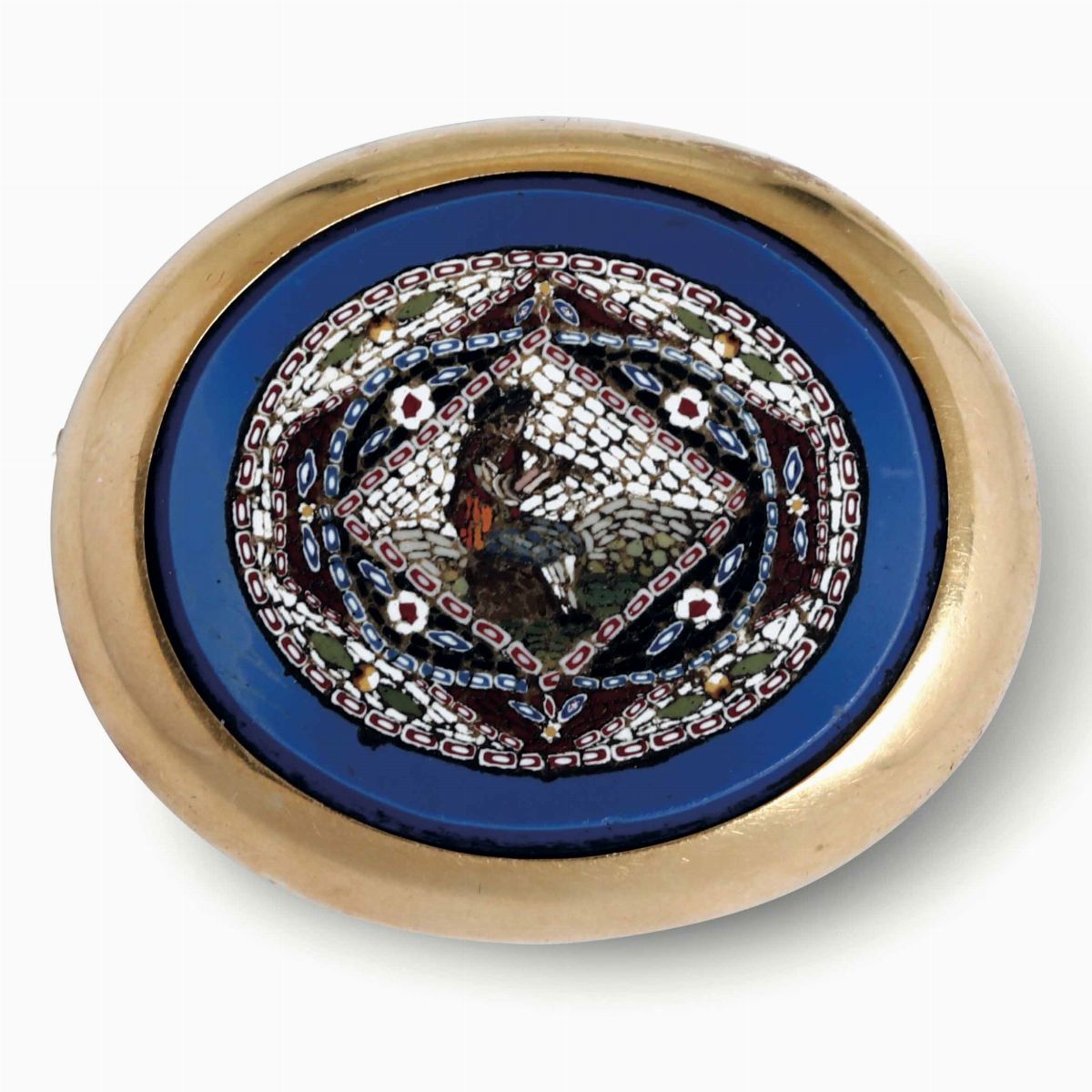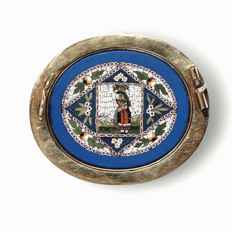 Spilla ovale con micromosaico su entrambi i lati, montata in oro basso, e spilla pendente con profilo in pietra lavica