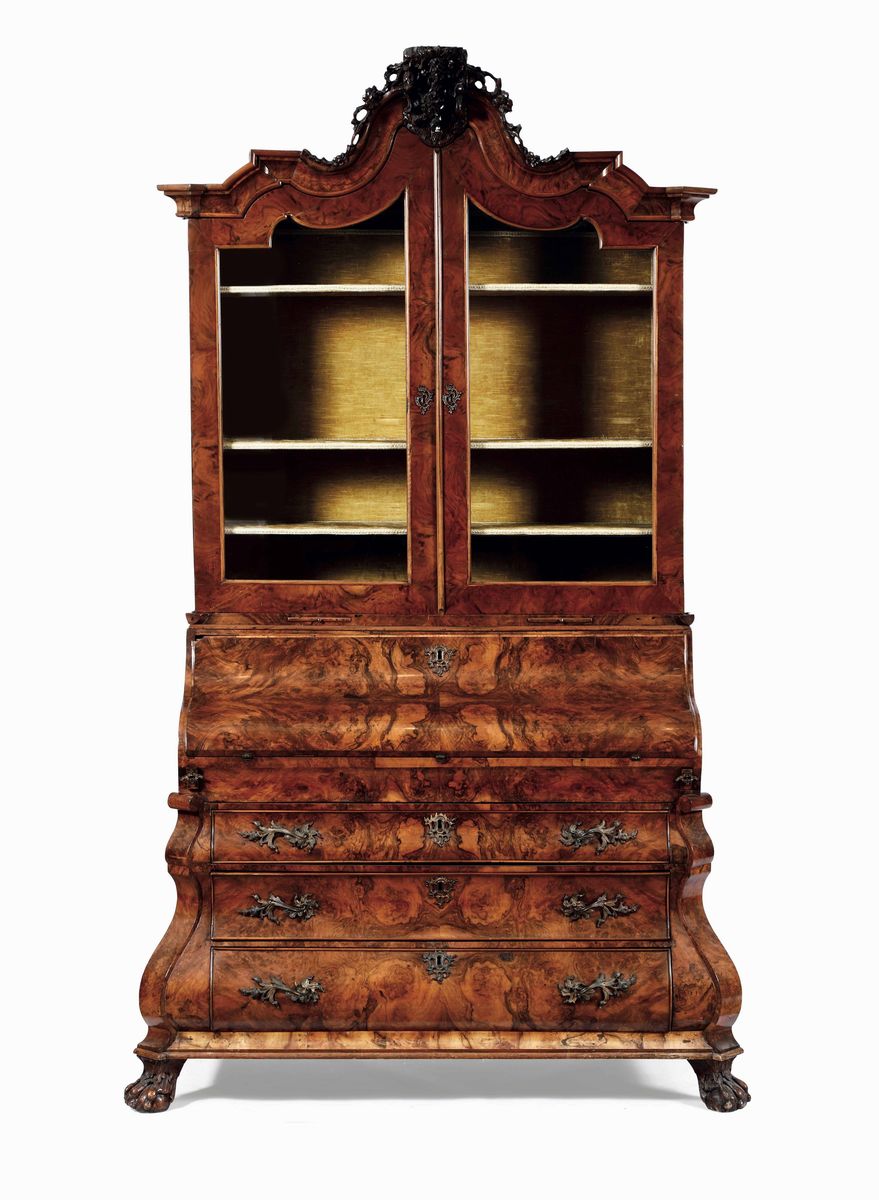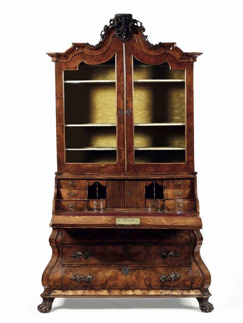 Fronte mosso con tre cassetti alla base poggiante su piedi ad artiglio di rapace, alzata a due ante a vetro.