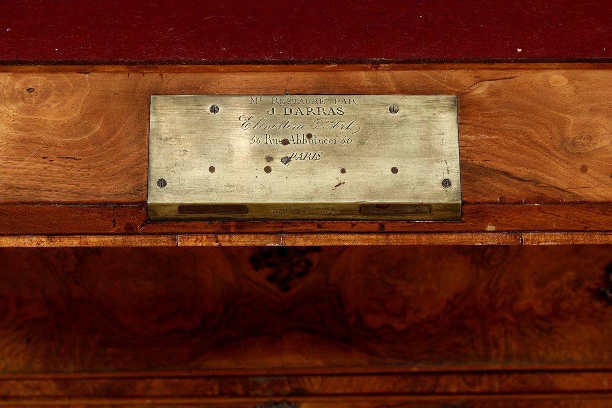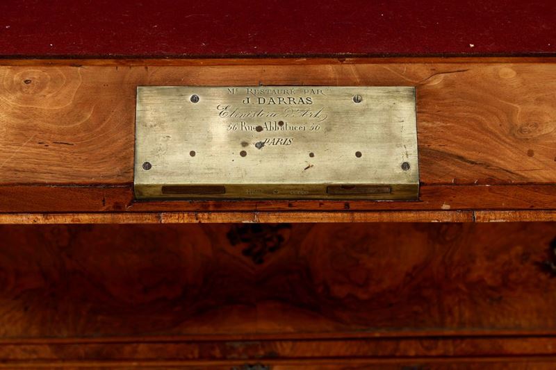La serratura della calatoia reca iscrizione del restauratore "M.e Restauré par J.Darras, Ebanisterie D'Art, 56 Rue Abbatucci, Paris"