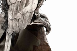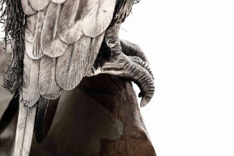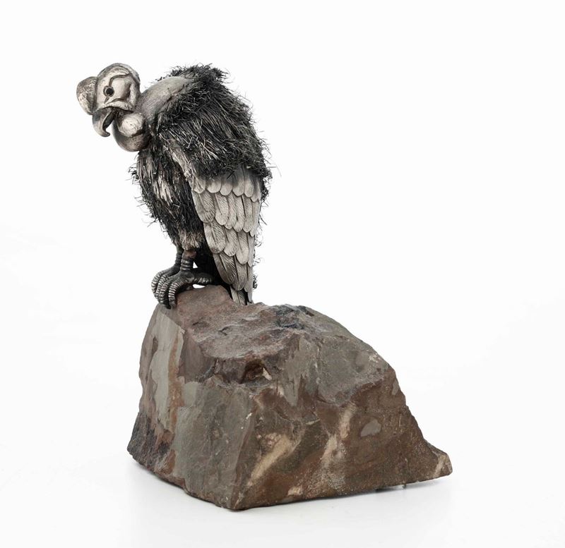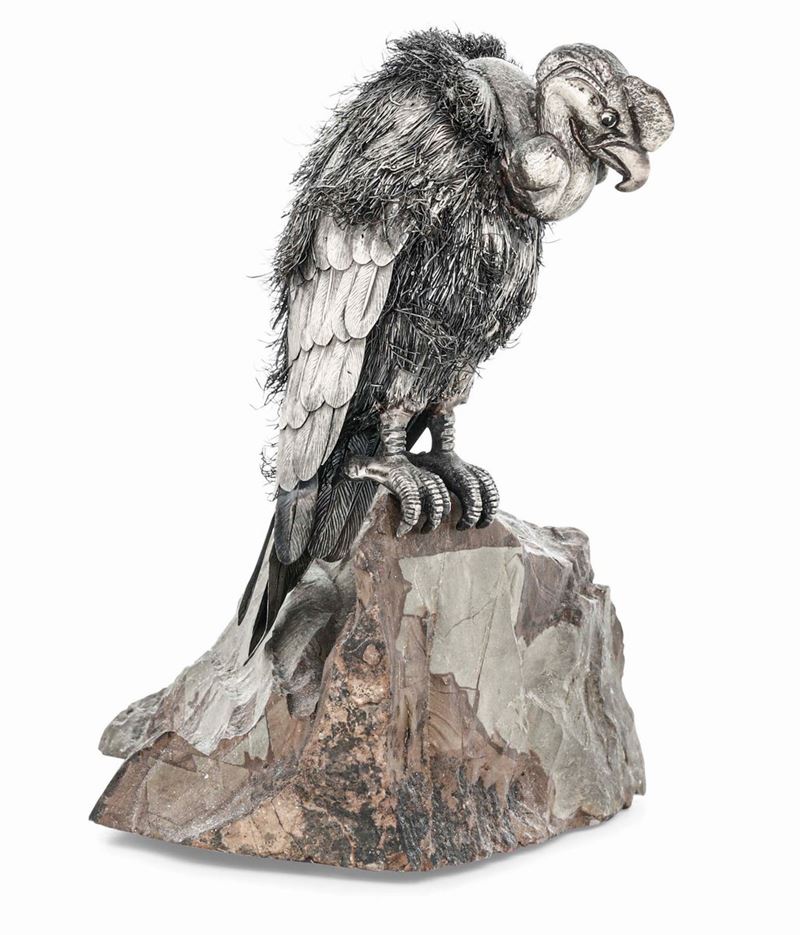 Condor in argento su pietra paesina. Argenteria artistica italiana del XX secolo. Firma incussa M. Buccellati