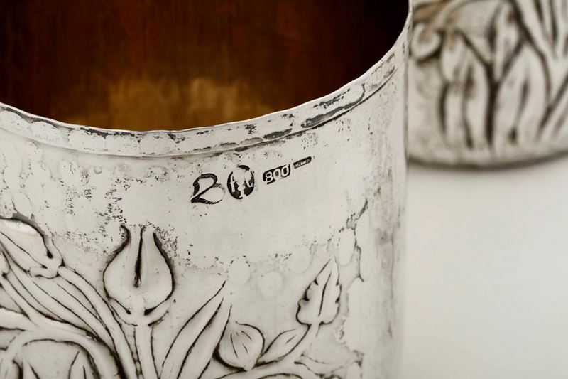Sei bicchieri in argento sbalzato. Argenteria artistica veneta del XX secolo. Argentiere F.lli Calegaro, Padova