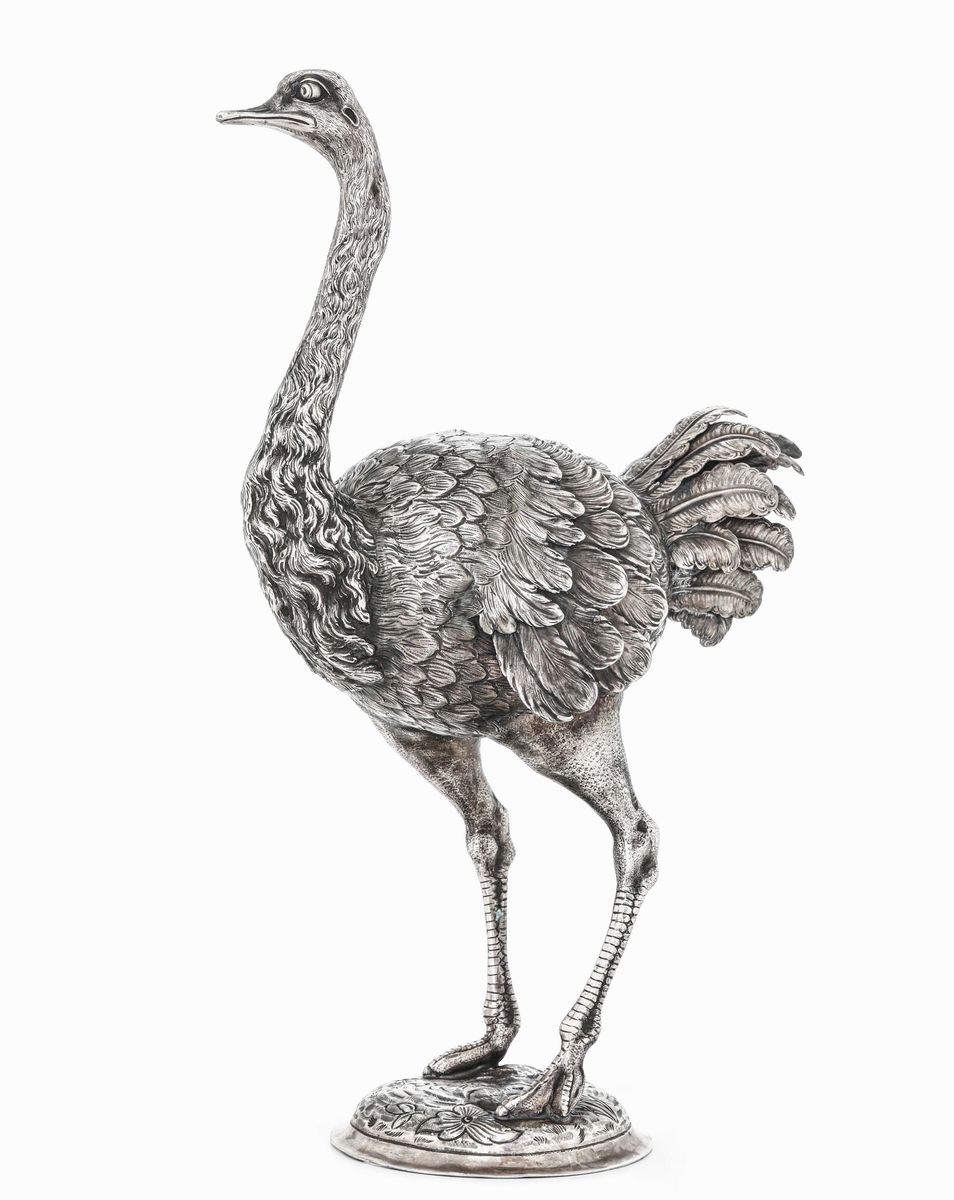 Struzzo in argento fuso, sbalzato e cesellato, argenteria artistica tedesca, inizi XX secolo (Francoforte ditta Simon) (?)