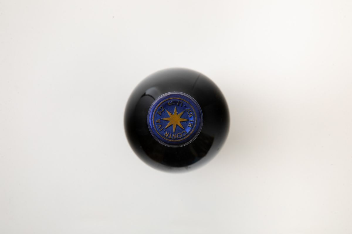(etichetta macchiata e capsula con segni d'usura del tempo)