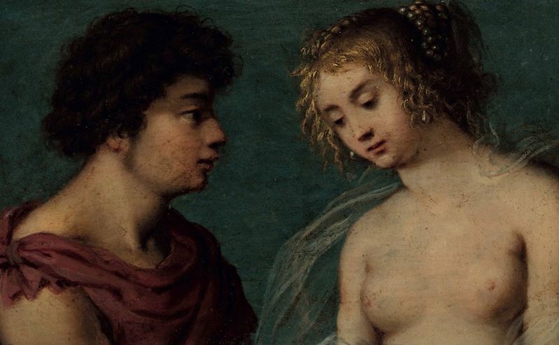 Difficile è poter stabilire con certezza quale sia il soggetto rappresentato. Il giovane sembra vestito all'antica, ciò indirizza verso un tema mitologico o classico; la nudità della giovane donna, che ha un atteggiamento timido e sottomesso, fa pensare a un rapporto chiaramente di natura amorosa o erotica fra i due protagonisti.