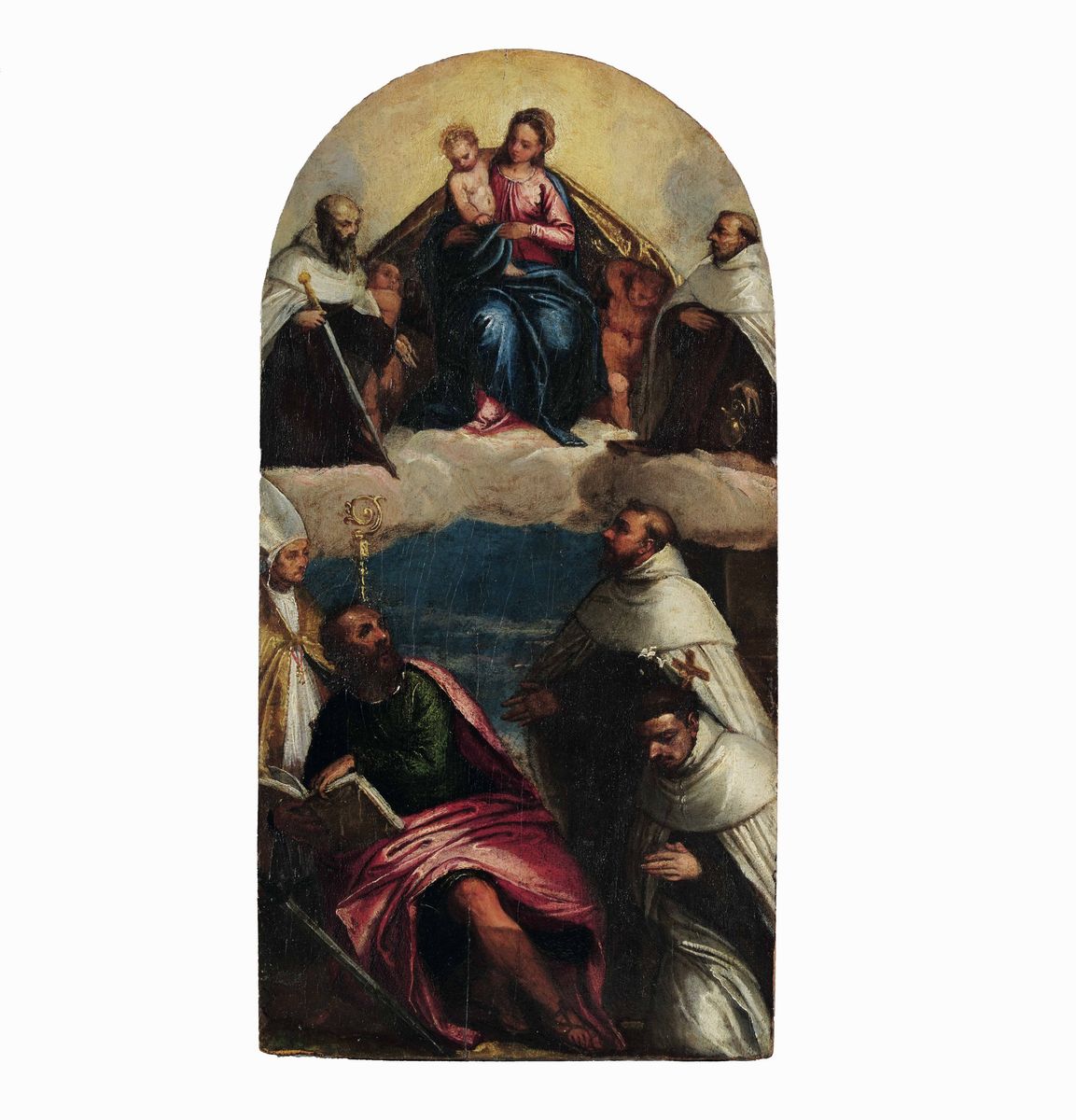 Le sigle formali messe in risalto dalla tavoletta e la sua materia pittorica, insieme all'impostazione compositiva ed alla sapienza progettuale dell'impianto lasciano invece intravedere da un lato una personalità più spiccata rispetto a quella del Badile, dall'altro un autore dalle caratteristiche stilistiche diverse da quelli appena elencati, ed inducono piuttosto a pensare ad una prova giovanile di Paolo Caliari detto il Veronese. A confortare tale ipotesi concorre una serie di confronti con le opere del maggiore artista veronese del Cinquecento, a partire dalla pala Bevilacqua Lazise del Museo di Castelvecchio (1548) e dal suo modelletto su carta della Galleria degli Uffizi: nella grande pala è la figura della Vergine ad evidenziare, nel volto e nel velo, contatti ravvicinati con quella della tavoletta. Se si esamina invece il modo di realizzare i panneggi, semplificato e cartaceo come nel caso del manto rosso di san Paolo, si possono stabilire diverse affinità di carattere esecutivo con il pregevole olio su carta degli Uffizi: con la manica del san Ludovico sulla destra, per esempio, che si avvicina anche, nella resa accurata delle pieghe, al già ricordato gioco dei bianchi e dei grigi sul mantello del frate inginocchiato sulla destra. Risulta poi convincente, a mio avviso, l'identità delle scelte cromatiche e della tavolozza fra queste opere, con rossi accesi e bianchi accecanti, con guizzanti bagliori d'oro nei manti: quello della Vergine nella tavoletta e quello di san Ludovico nella pala e, soprattutto, nel bozzetto fiorentino.