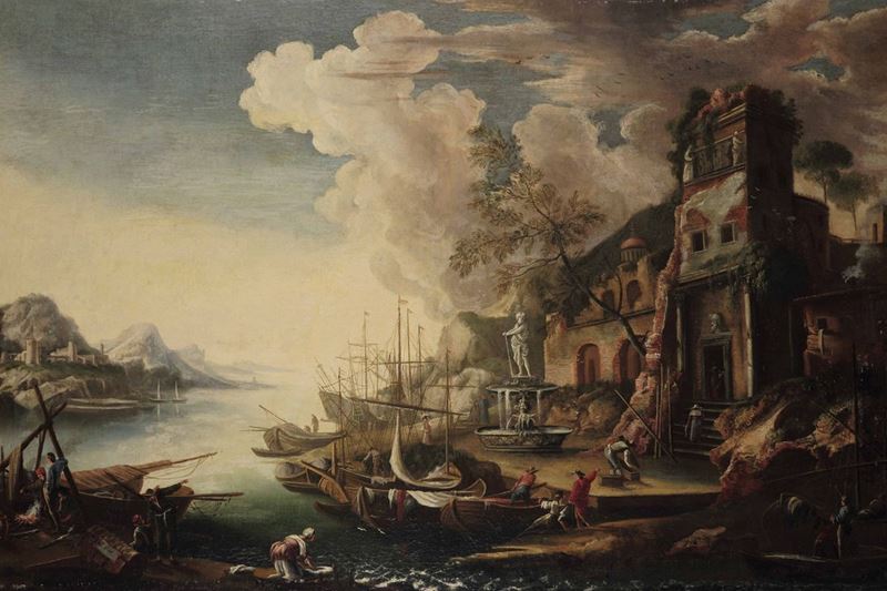 Scuola romana del XVIII secolo Veduta fantastica di porto con rovine architettoniche e imbarcazioni
