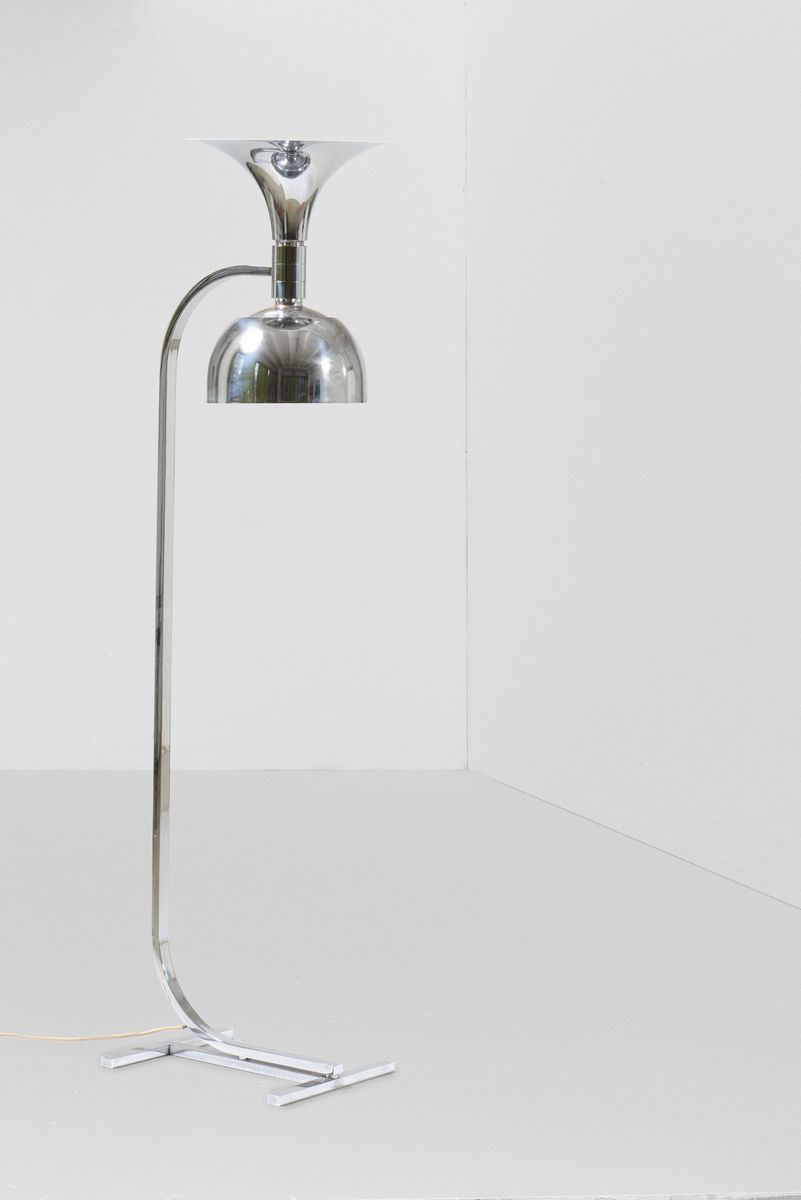 Lampada da terra con struttura e diffusore in metallo cromato.