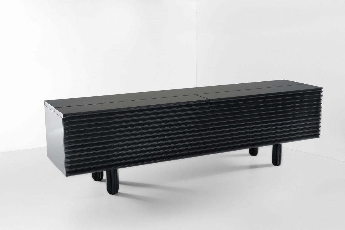 Struttura in legno, piano apribile a ribalta, superfici in legno grissinato e cassetti a scomparsa.