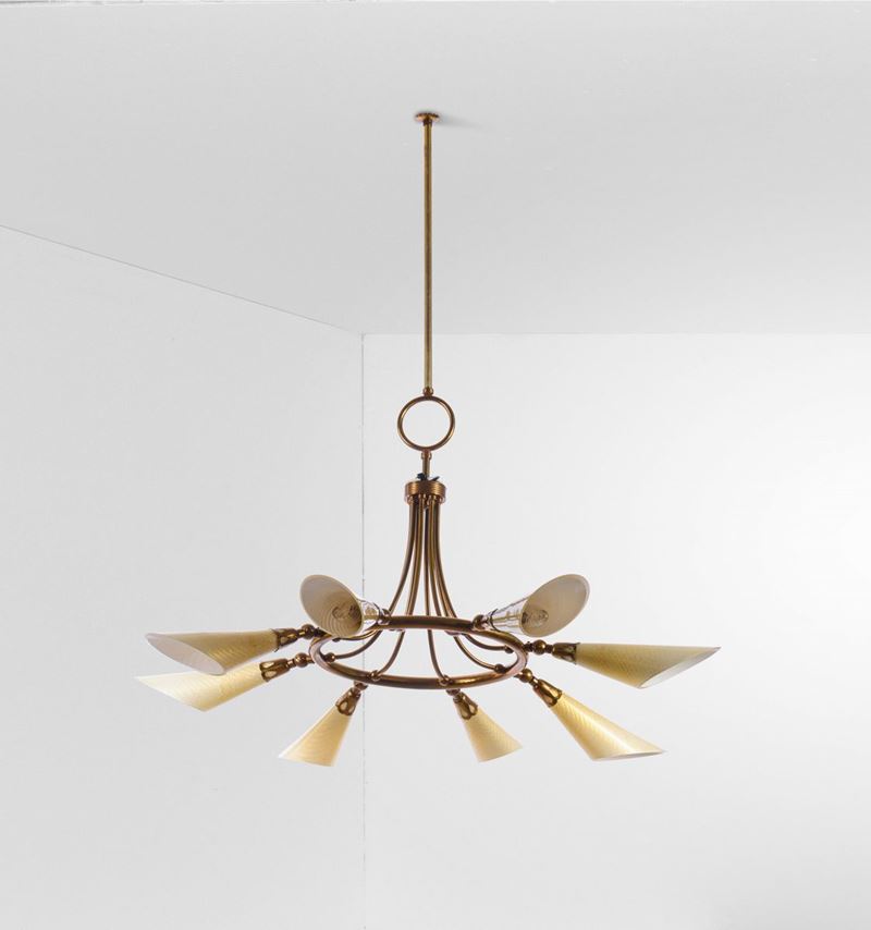Struttura in ottone e diffusori orientabili in vetro di Murano e inclusioni in oro.