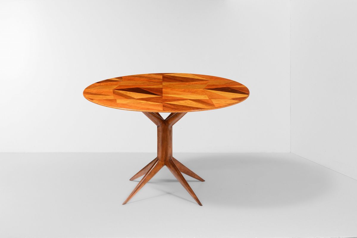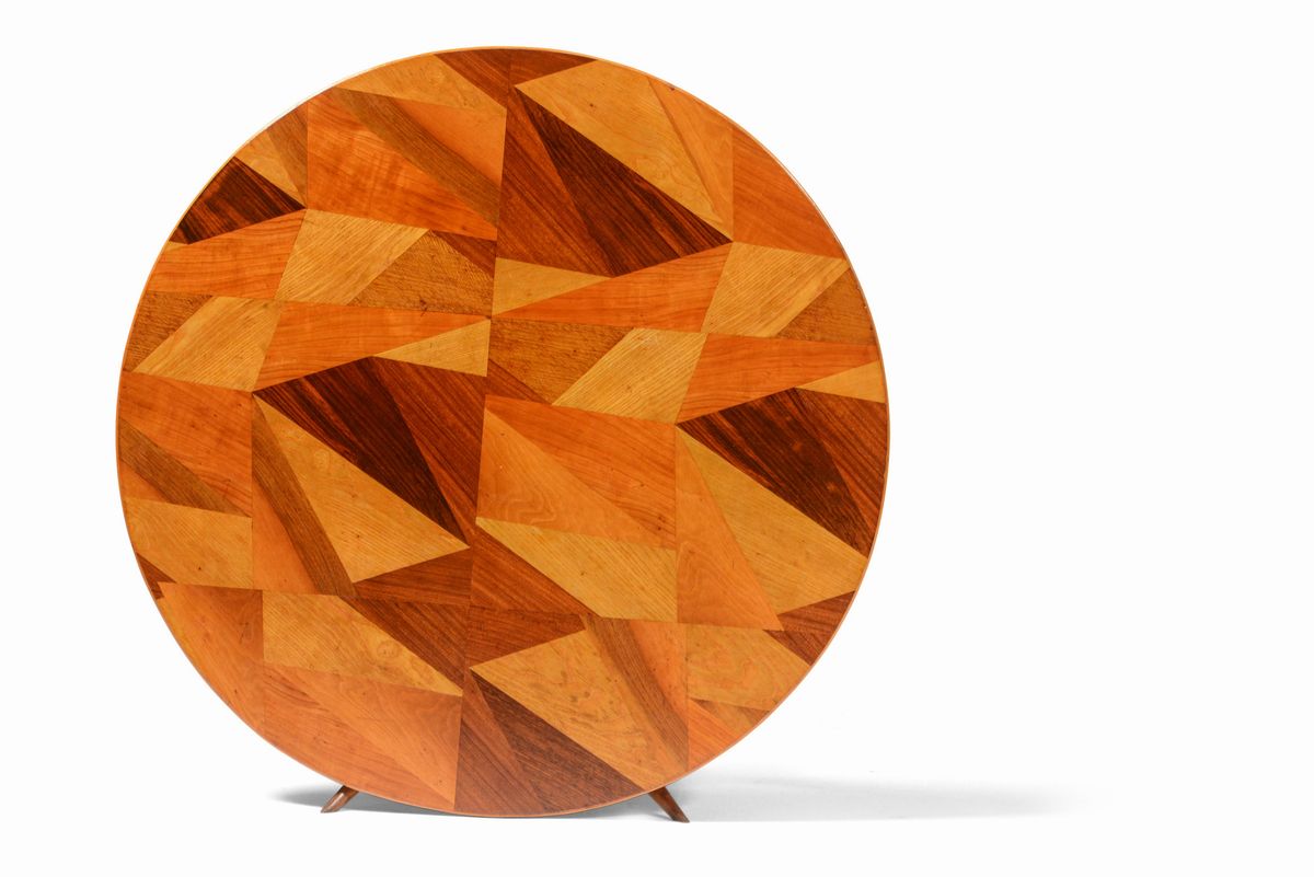 Tavolo con struttura in legno e piano lastronato a mosaico in diverse essenze.