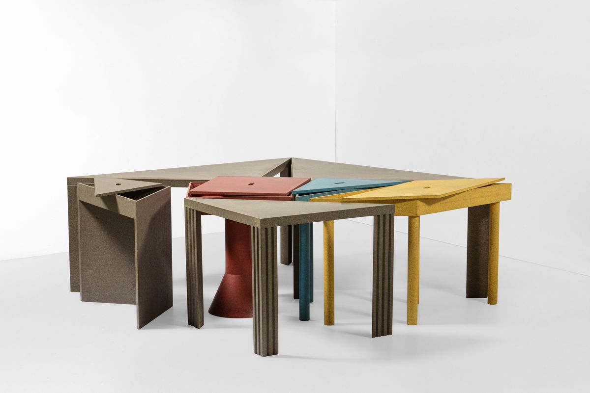Tavolo modulare mod. Tangram composto da sette elementi in legno laccato.