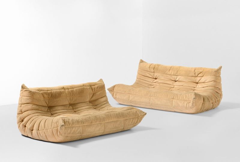 Coppia di divani mod. Togo rivestimenti in alcantara.