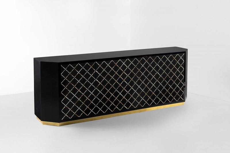 Grande mobile contenitore con struttura in legno laccato, supporto in ottone e intarsi in madreperla.