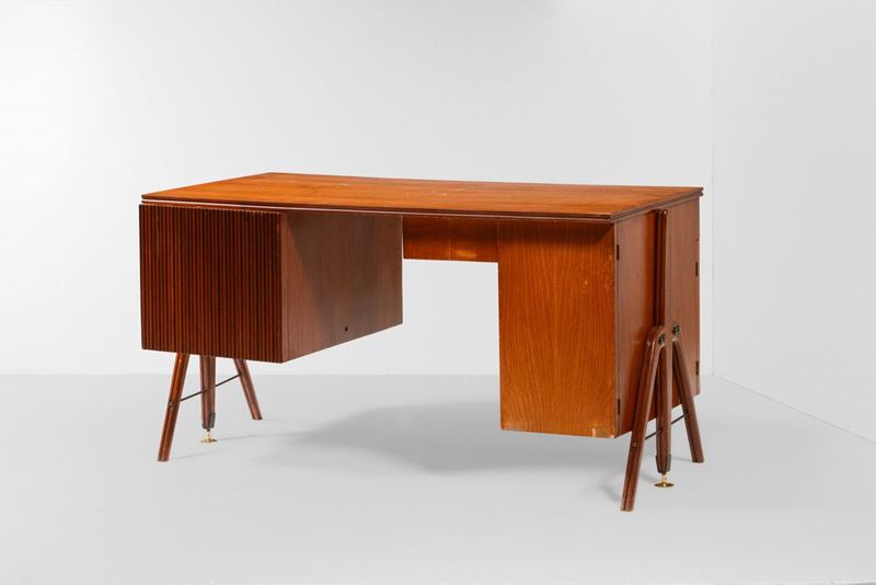 Struttura, piano e cassetti in legno, anta in rivestita in legno grissinato, cassetto rivestito in laminato, particolari in ottone.