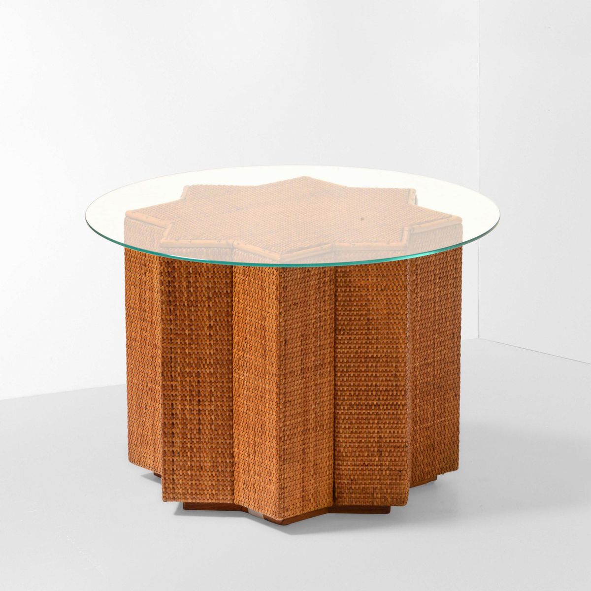 Tavolo basso con struttura in vimini e giunco, piano in cristallo molato.