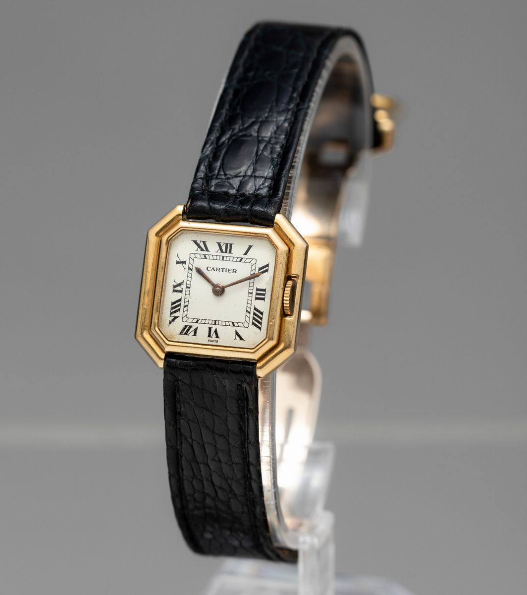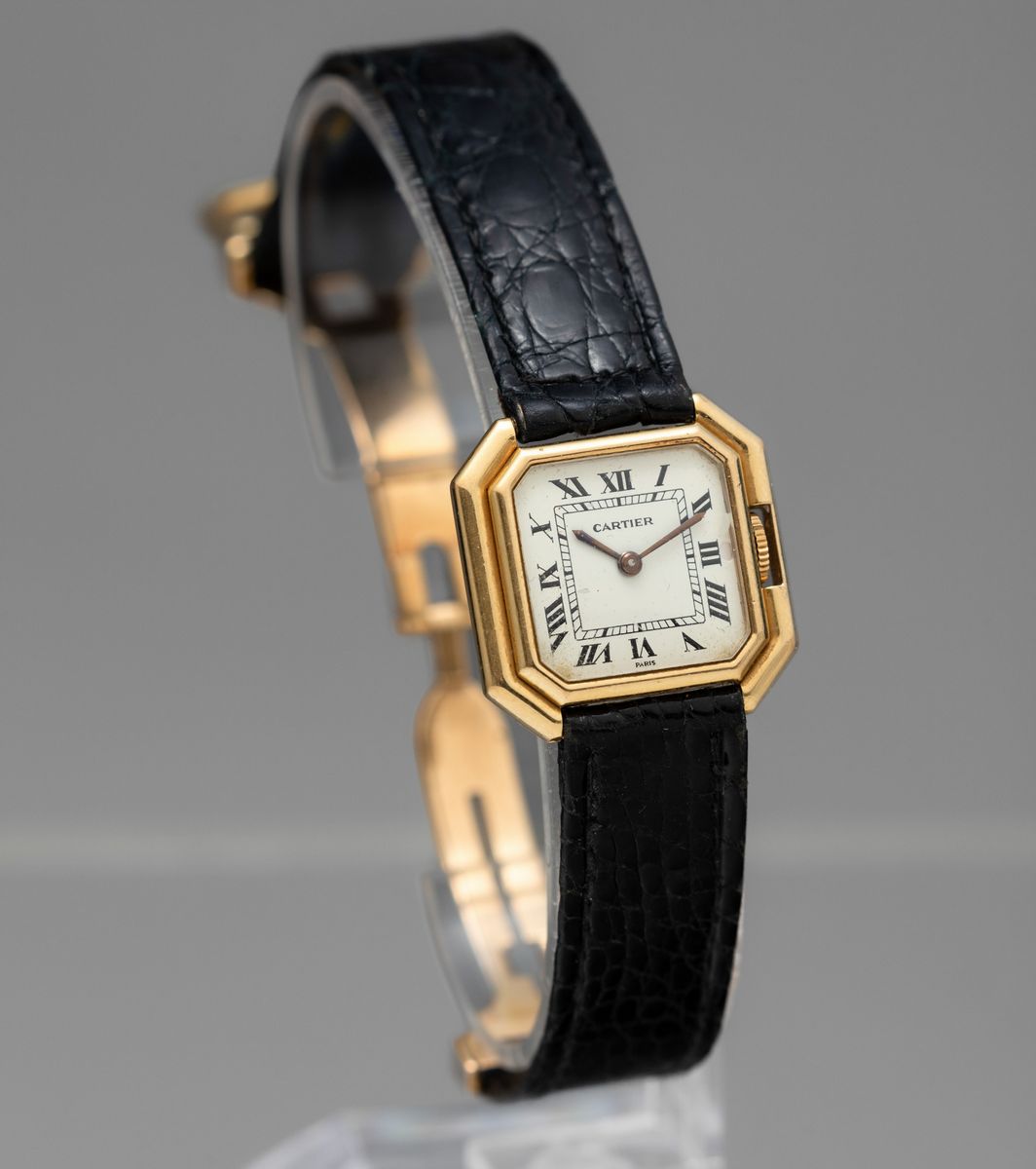 CARTIER - Ceinture, raro orologio di forma ottagonale in oro 18k carica manuale, quadrante numeri Romani con deployante