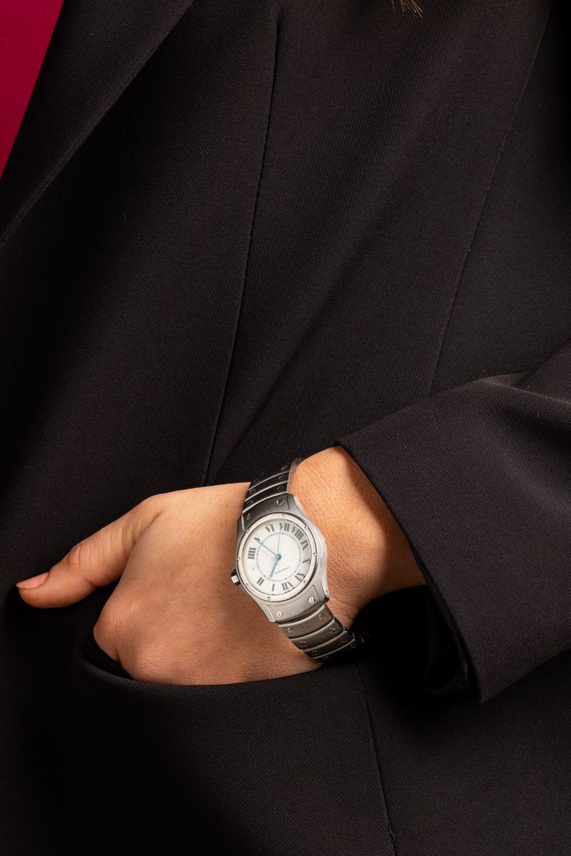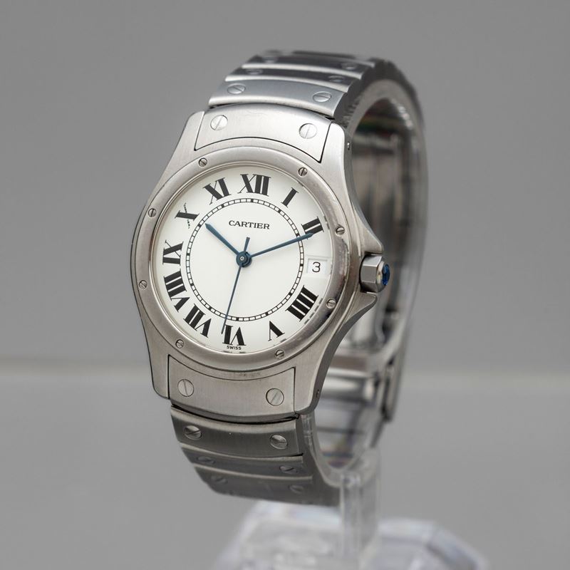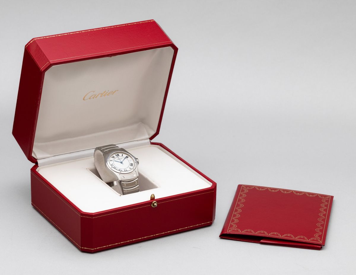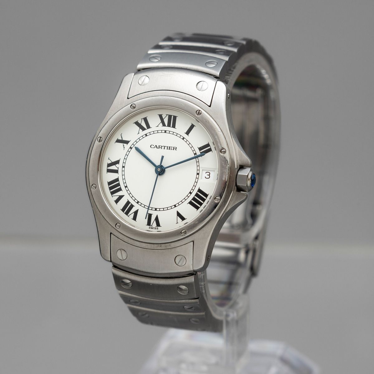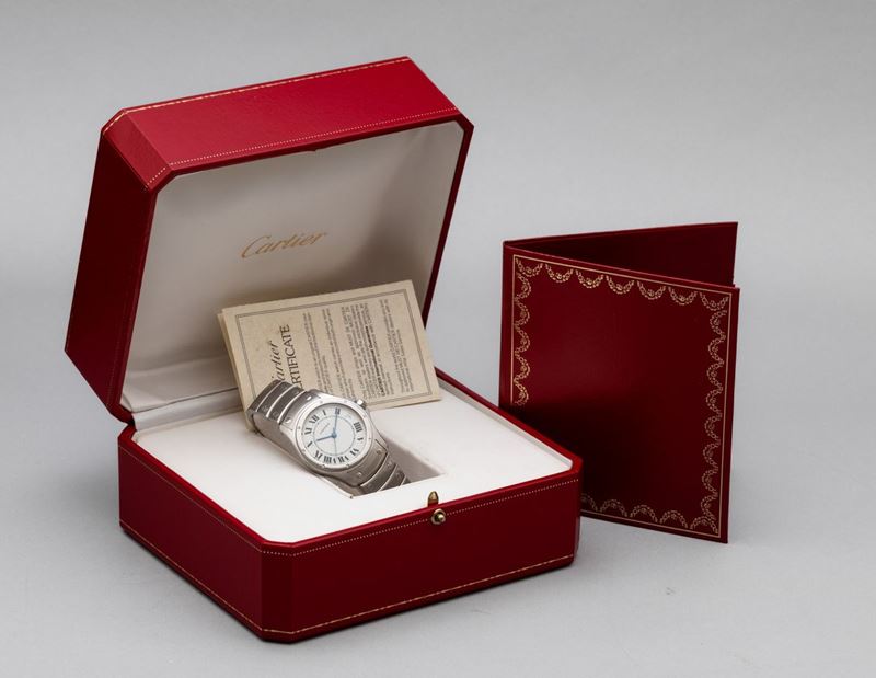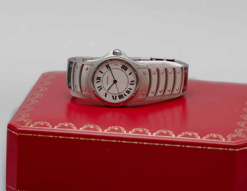 CARTIER - Santos Rondè automatico in acciaio con datario, quadrante bianco e numeri Romani. Accompagnato da astuccio originale [..]
