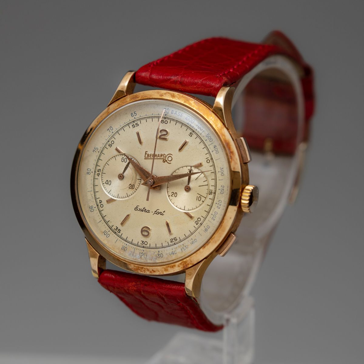 EBERHARD - Extrafort ref 14007 cronografo due contatori d'oro 18k con tasti quadri, carica manuale anni '50
