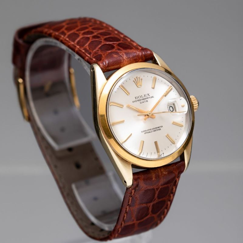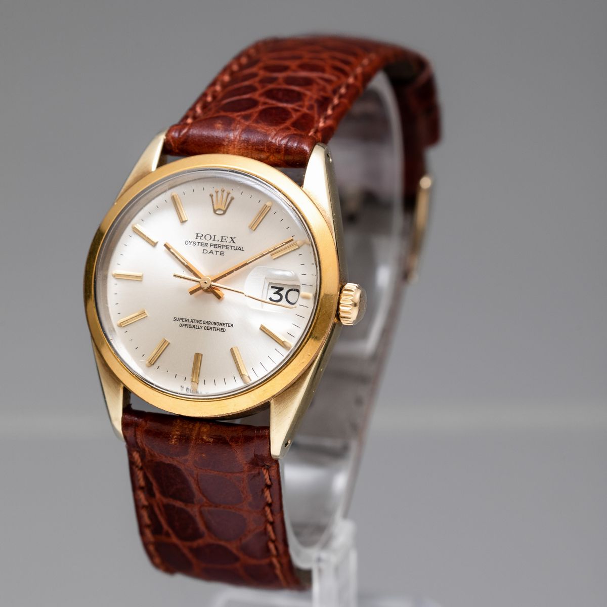 ROLEX - Raro Date ref 1550 "Gold Shell", in acciaio incamiciato d'oro con fibbia laminata originale.