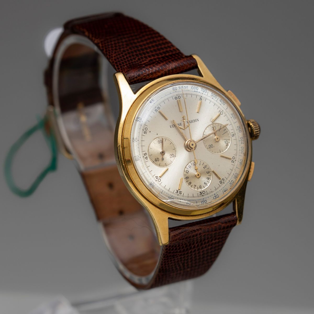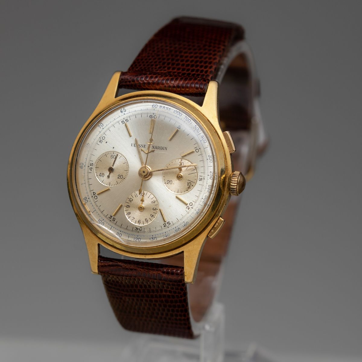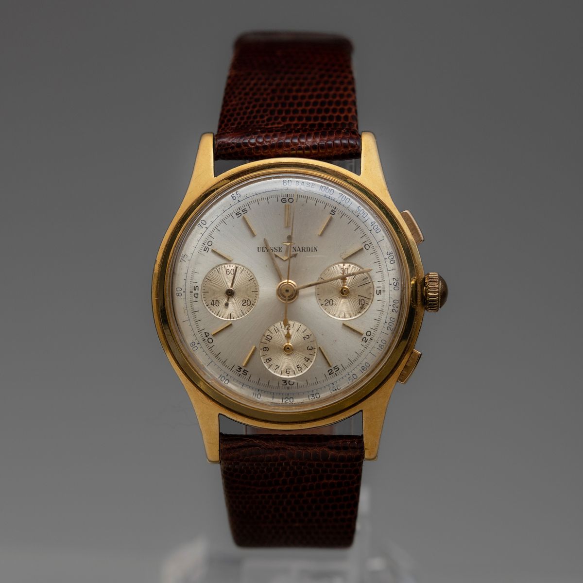 ULYSSE NARDIN - Cronografo tre contatori Valjoux 72 con cassa in oro giallo, tasti quadri e fondello a scatto.