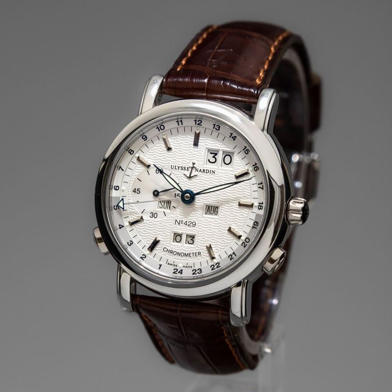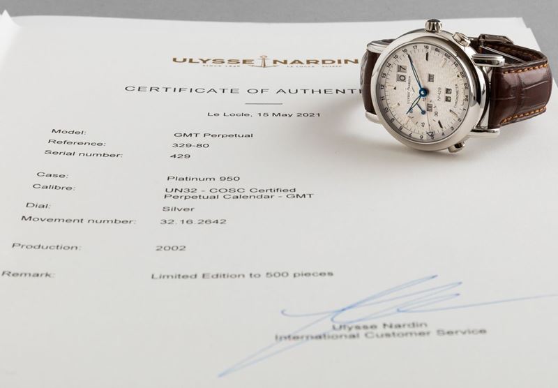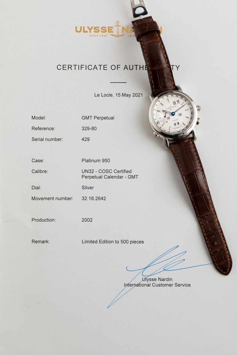 ULYSSE NARDIN - Perpetual Calendar GMT ref 329-80. Orologio da polso in platino 500 pezzi, con doppio fuso orario, datario [..]