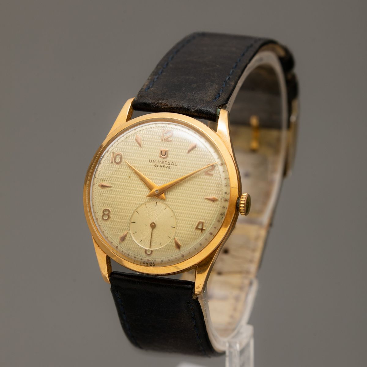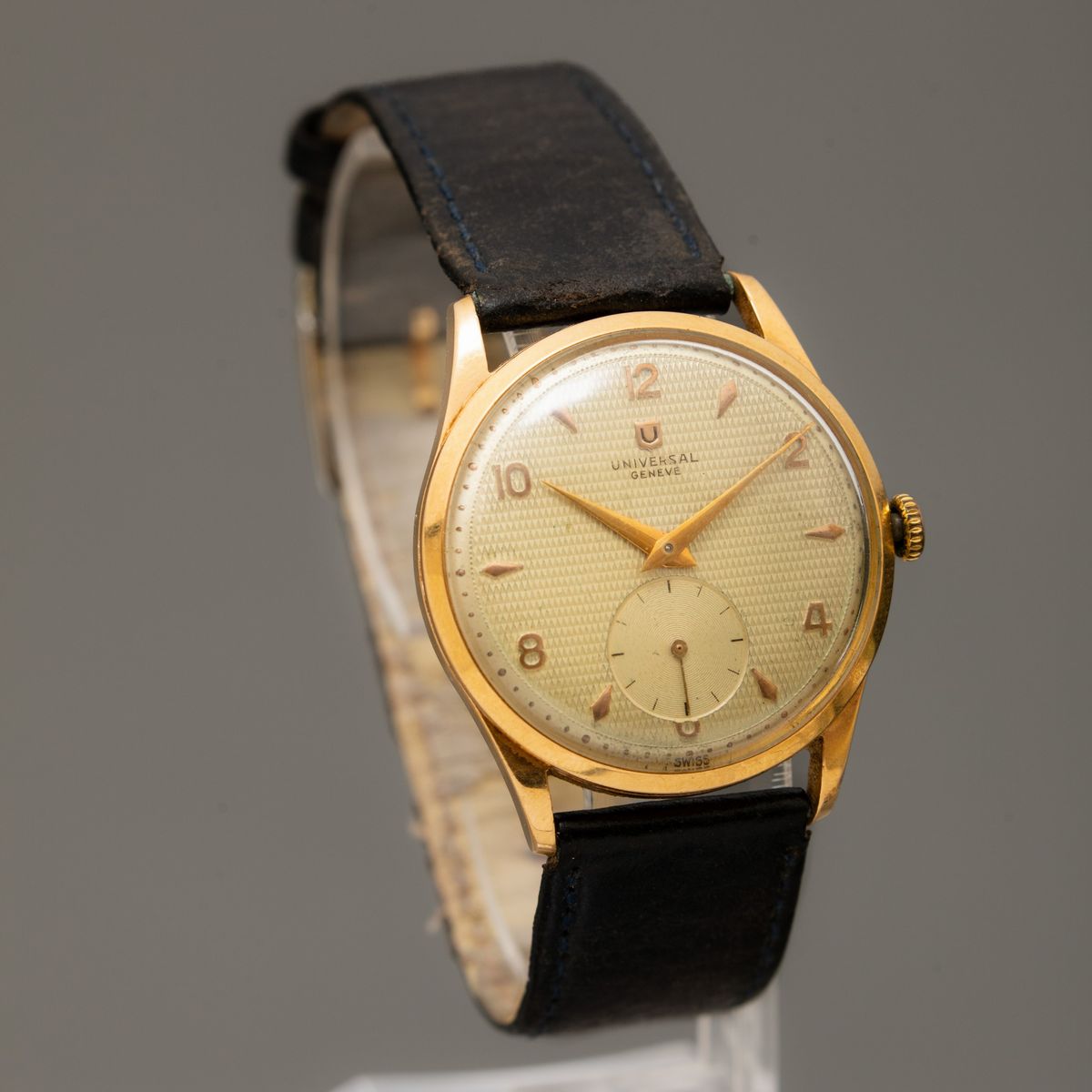 UNIVERSAL GENEVE - Orologio solo tempo carica manuale con cassa in oro giallo 18k, quadrante guillochè e piccoli secondi [..]