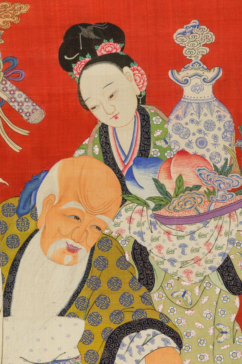 Grande Kesi su seta raffigurante saggio con cerbiatto e fanciulla su fondo rosso, Cina, Dinastia Qing, inizio XX secolo