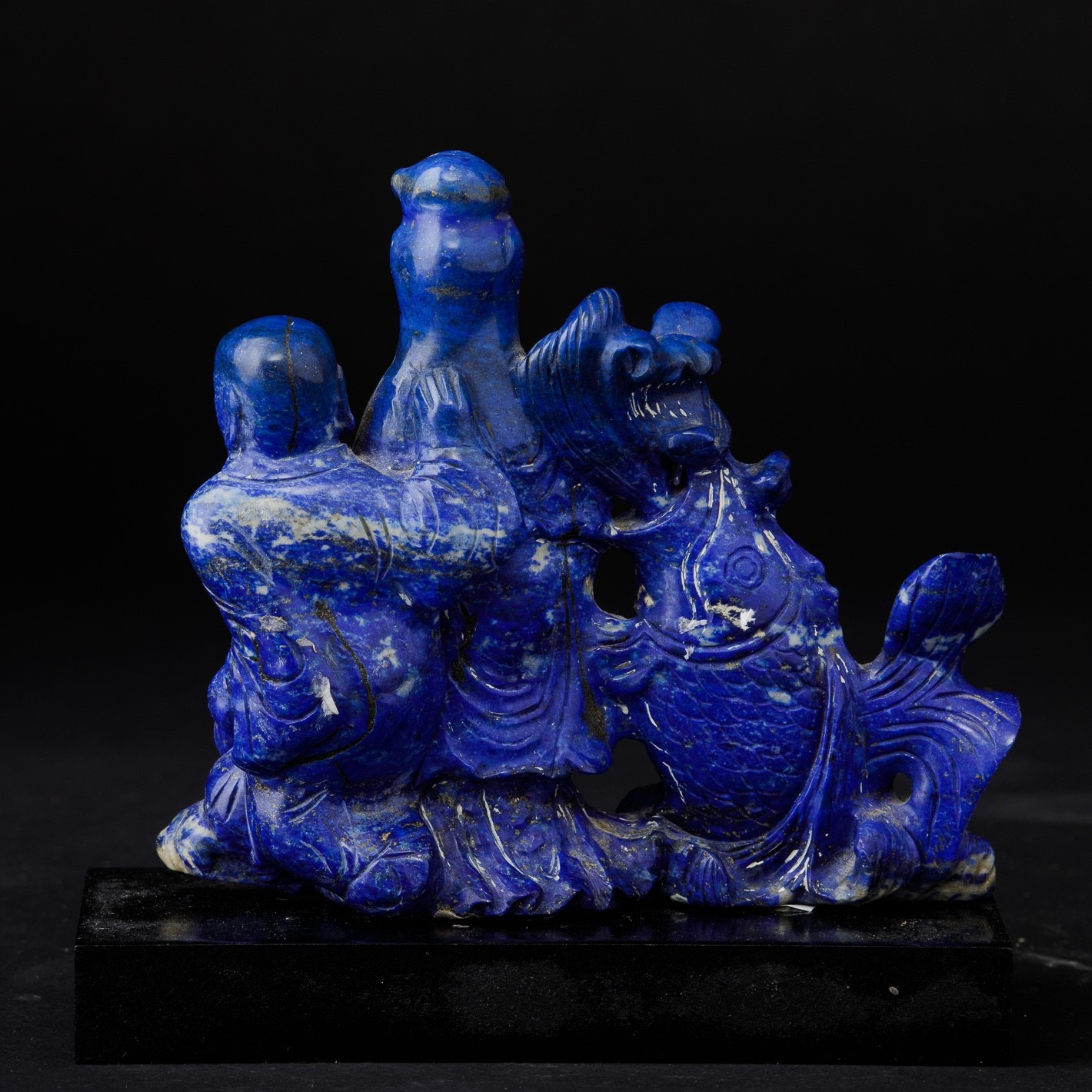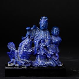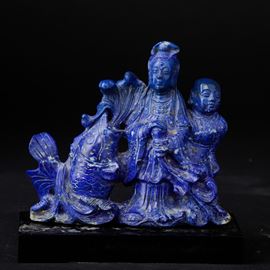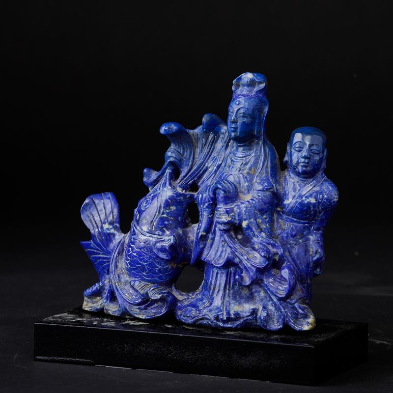 Gruppo scolpito in lapislazzulo raffigurante fanciulla con bambino e carpa, Cina, XX secolo