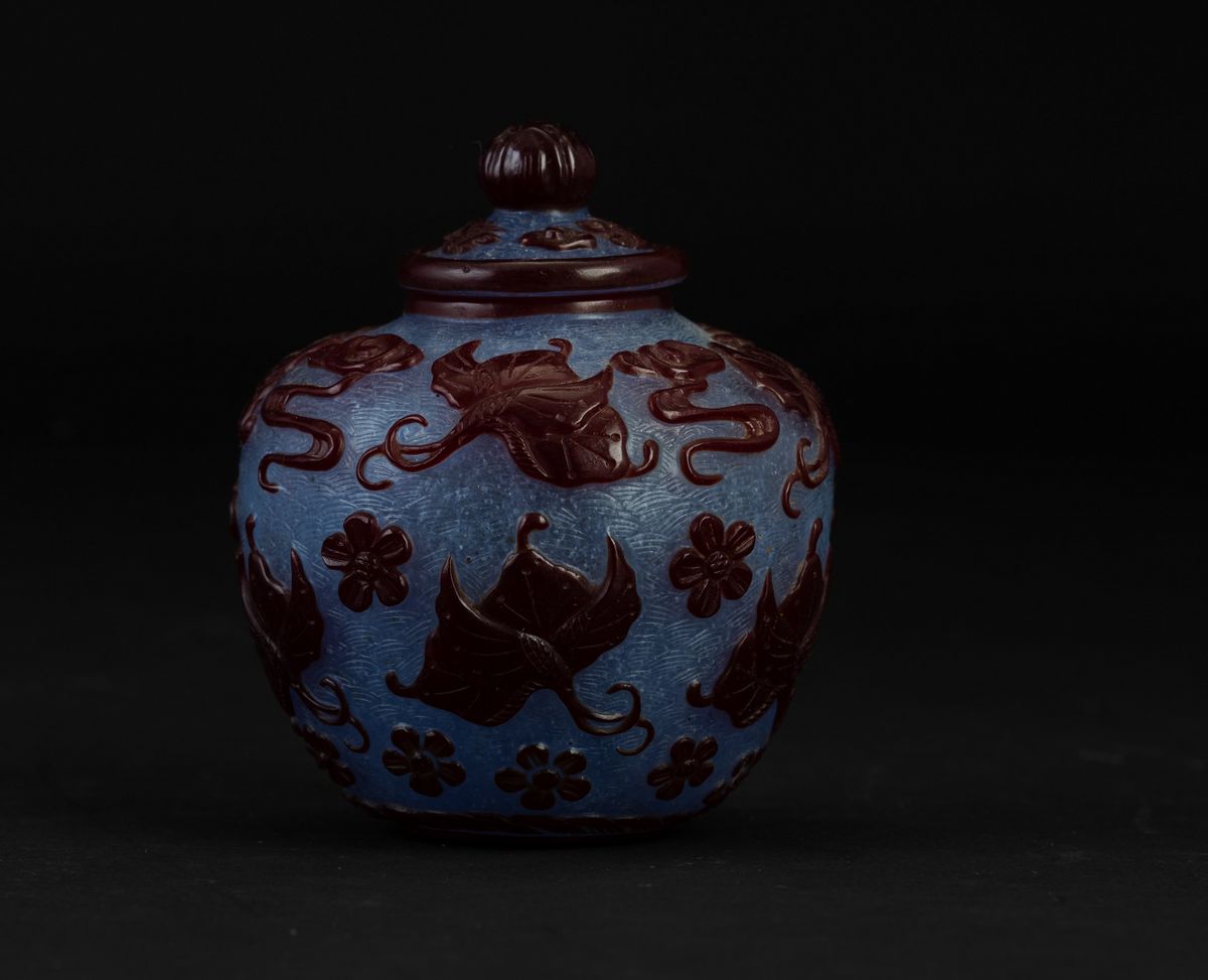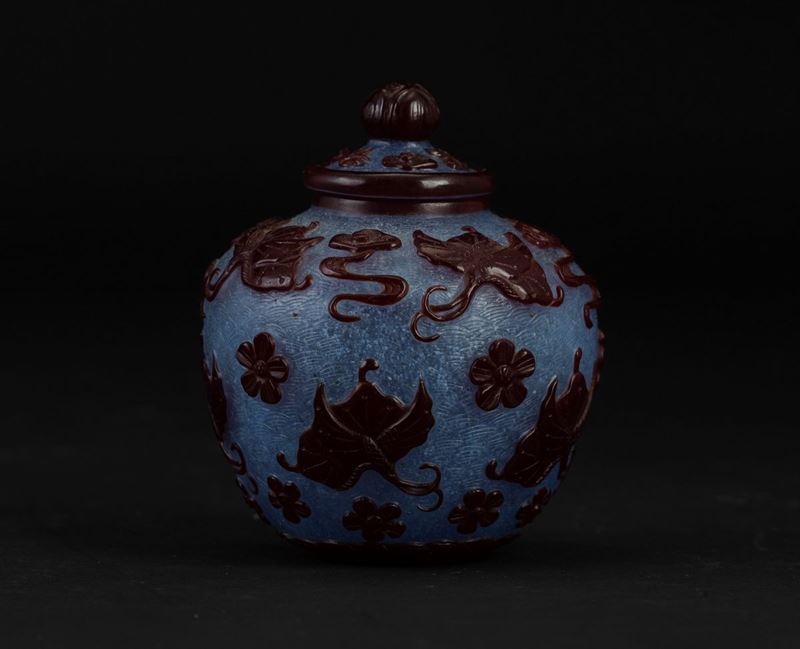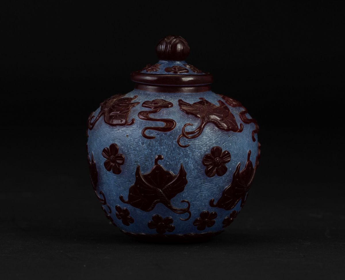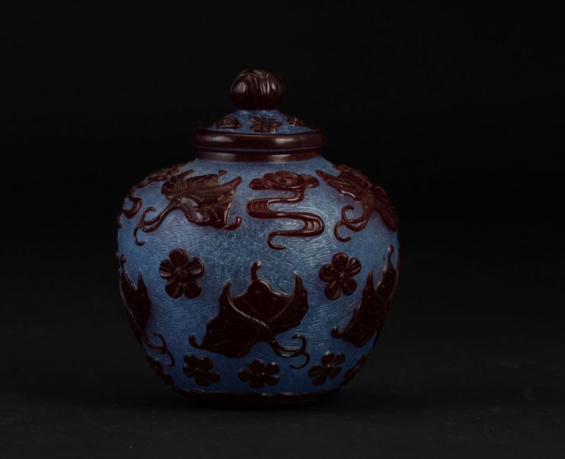 Piccolo vaso con coperchio in vetro di Pechino con decori floreali e di farfalle a rilievo su fondo azzurro, Cina, Dinastia [..]