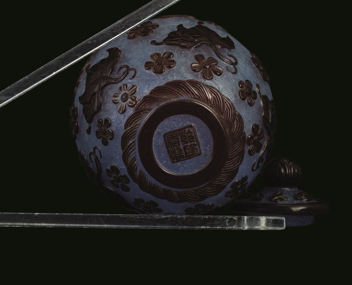 Piccolo vaso con coperchio in vetro di Pechino con decori floreali e di farfalle a rilievo su fondo azzurro, Cina, Dinastia Qing, marca e del periodo Qianlong (1736-1796)