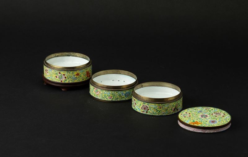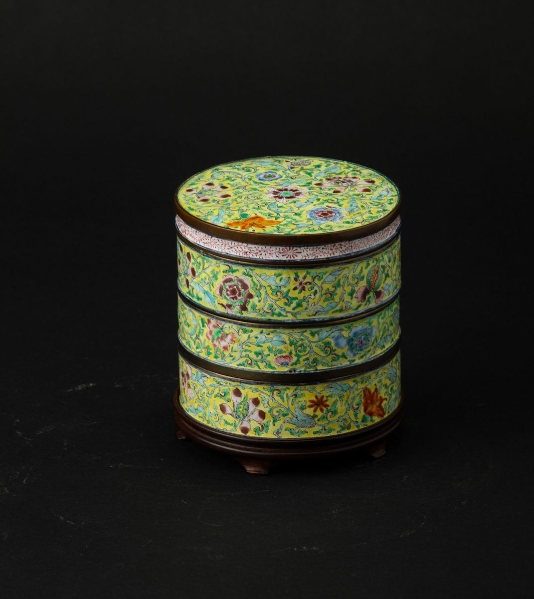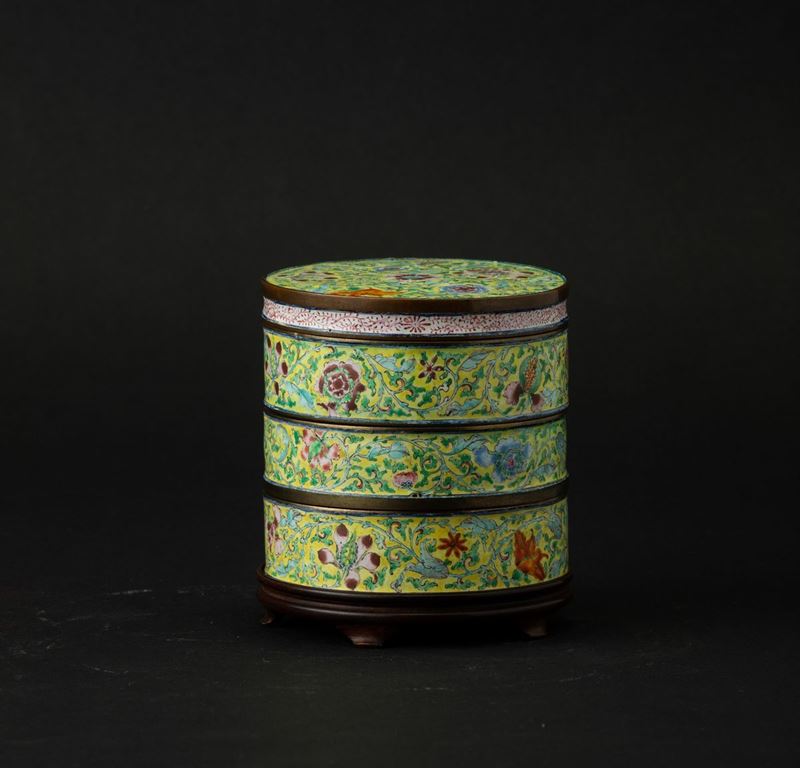 Portavivande cilindrico in smalto Canton con decoro a fiori di loto, Cina, Dinastia Qing, epoca Qianlong (1736-1796)