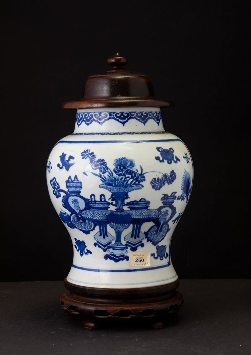 Potiche in porcellana bianca e blu con coperchio in legno e decoro naturalistico, Cina, Dinastia Qing, epoca Kangxi (1662 [..]