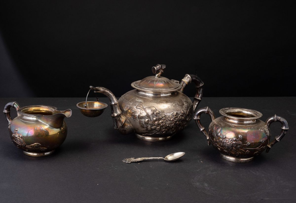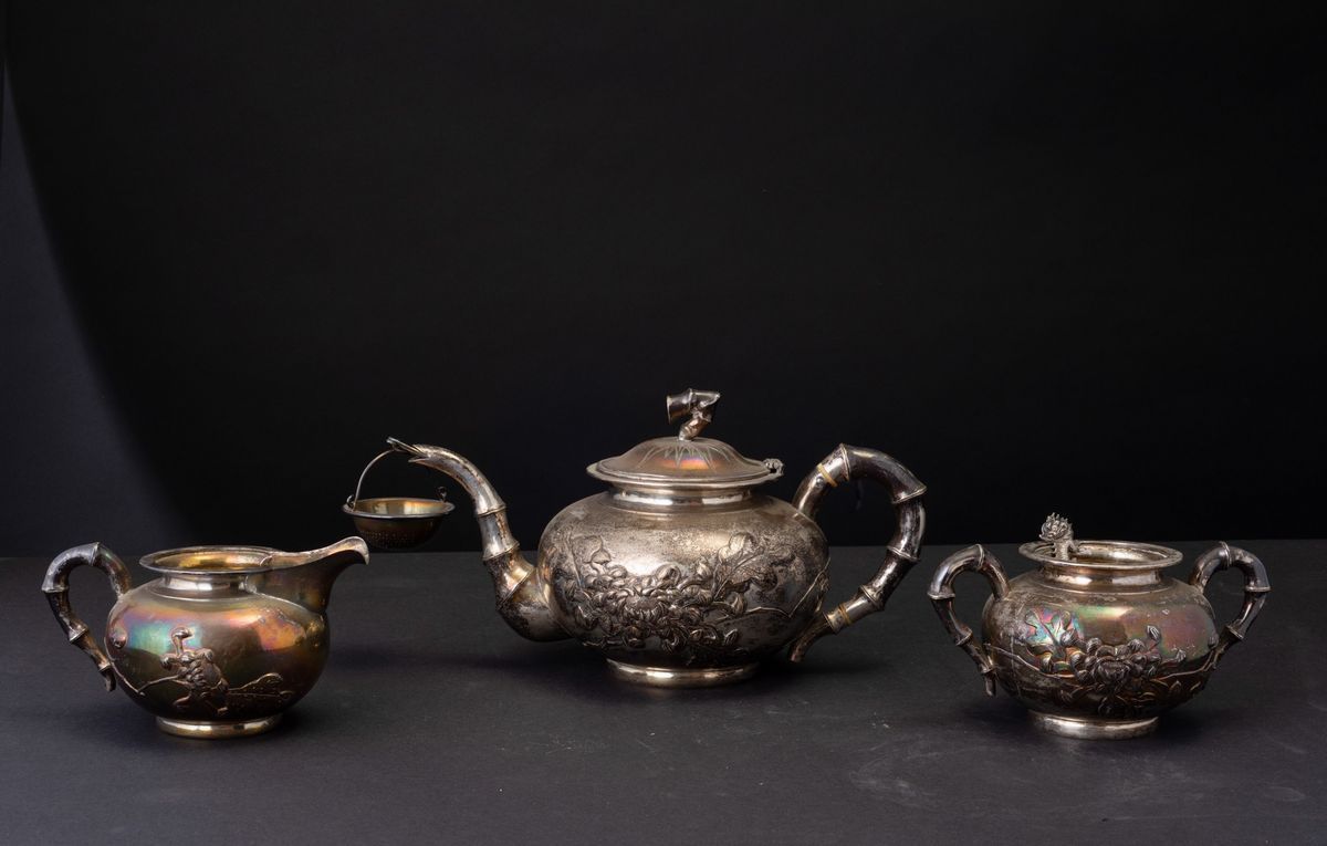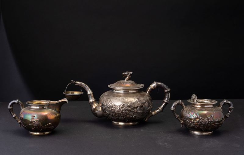 Servizio da thè in argento composto da teiera, zuccheriera con cucchiaino e lattiera con decori floreali a rilievo e dettagli a foggia di canna di bambù, Cina, Dinastia Qing, XIX secolo