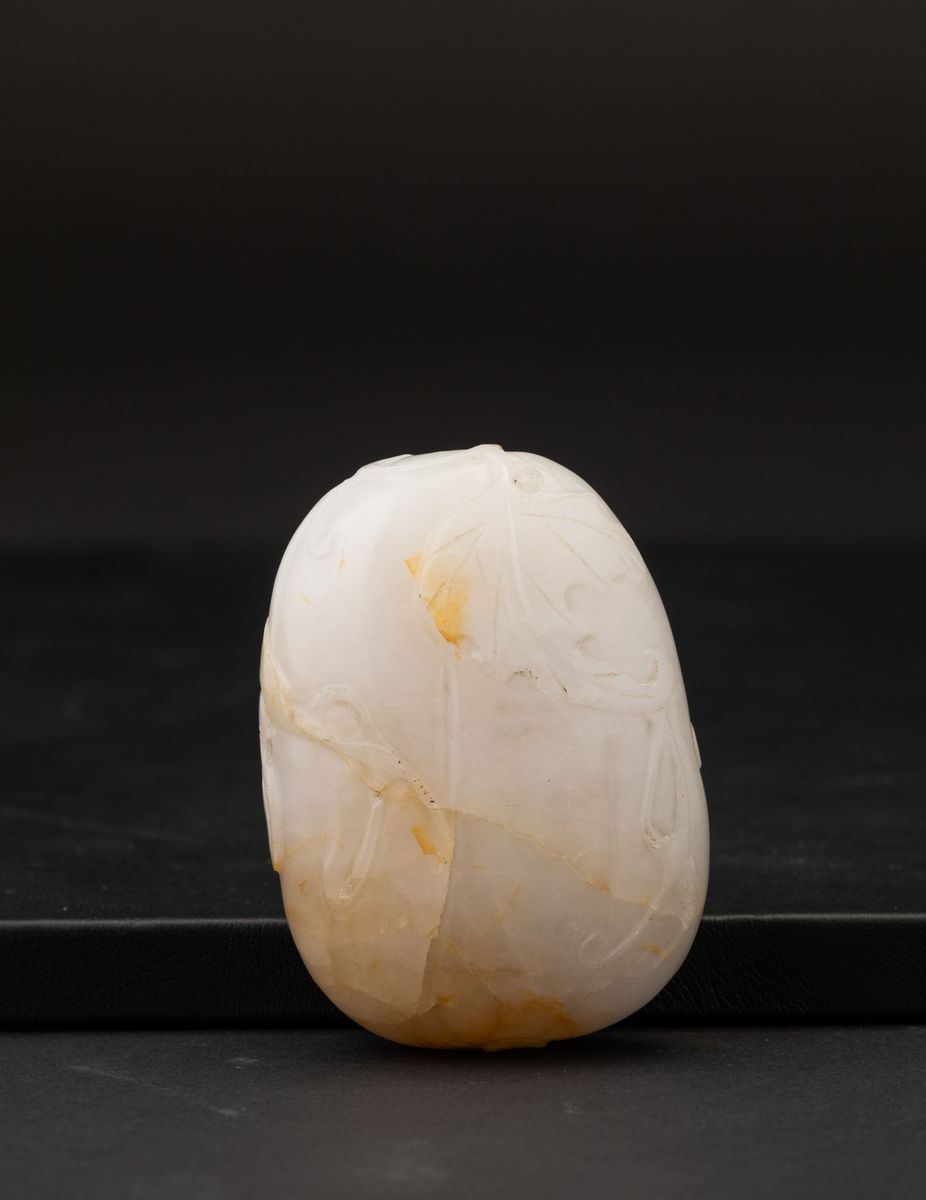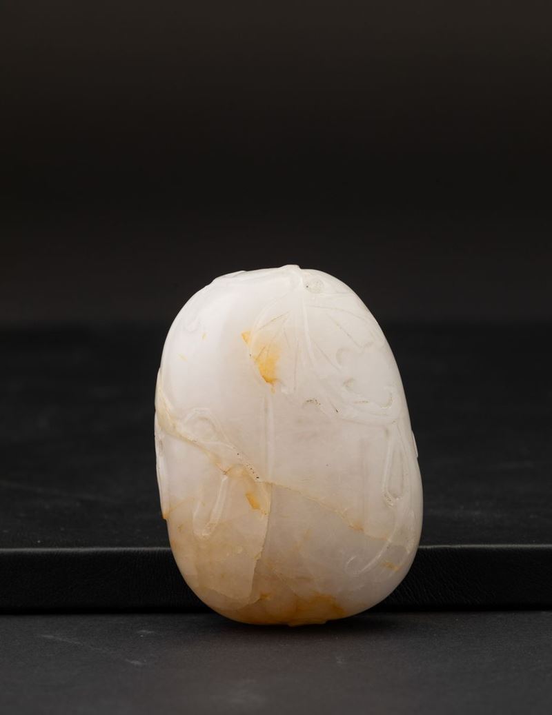 Snuff bottle in giada bianca e russet con soggetti naturalistici a rilievo, Cina, Dinastia Qing, XIX secolo