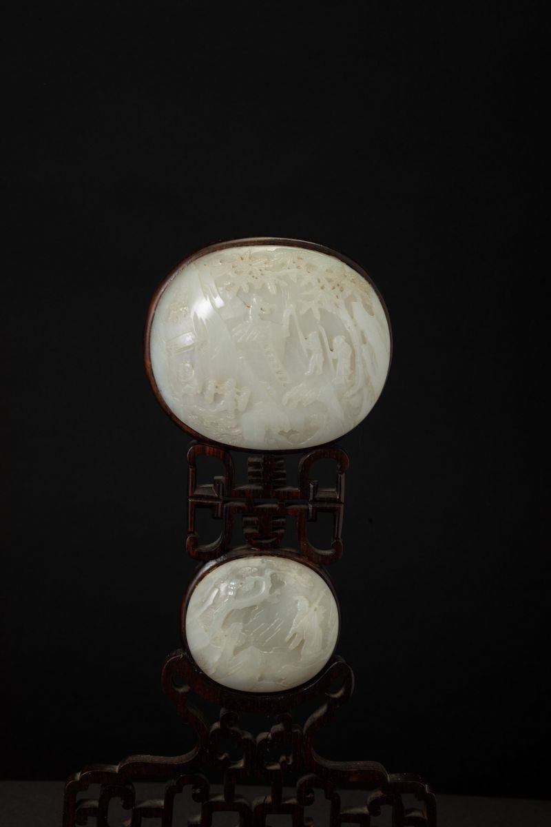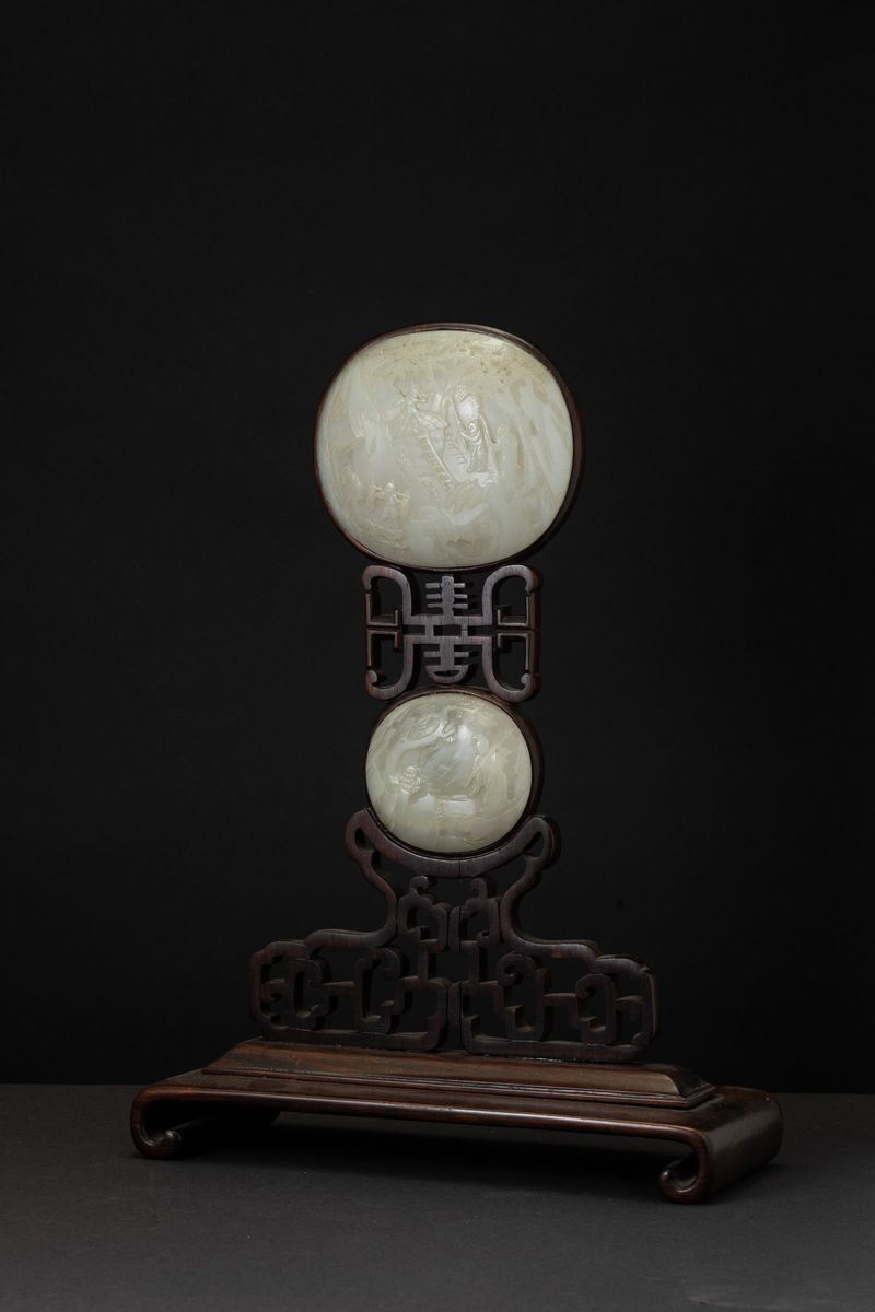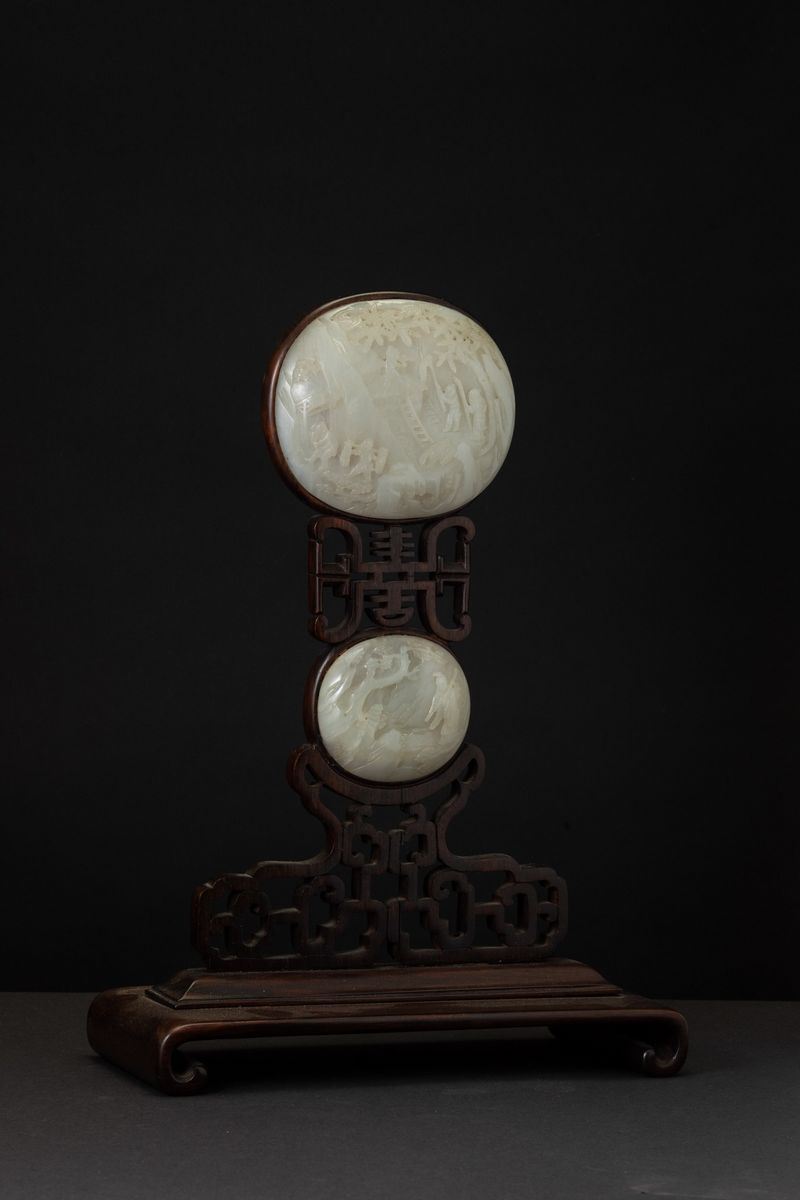 Stand scolpito in legno di Hongmu con placche in giada bianca raffiguranti scena di vita comune e paesaggio, Cina, Dinastia Qing, epoca Qianlong (1736-1796)