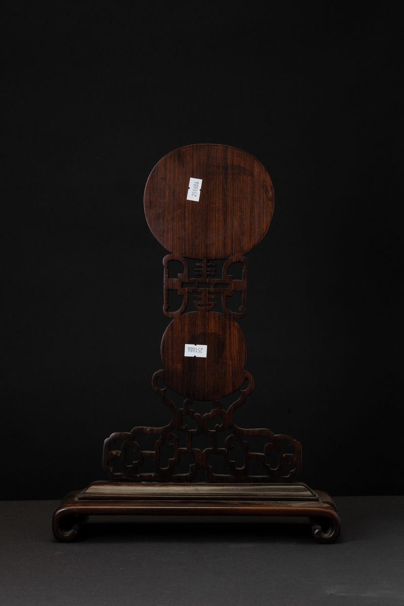 Stand scolpito in legno di Hongmu con placche in giada bianca raffiguranti scena di vita comune e paesaggio, Cina, Dinastia [..]