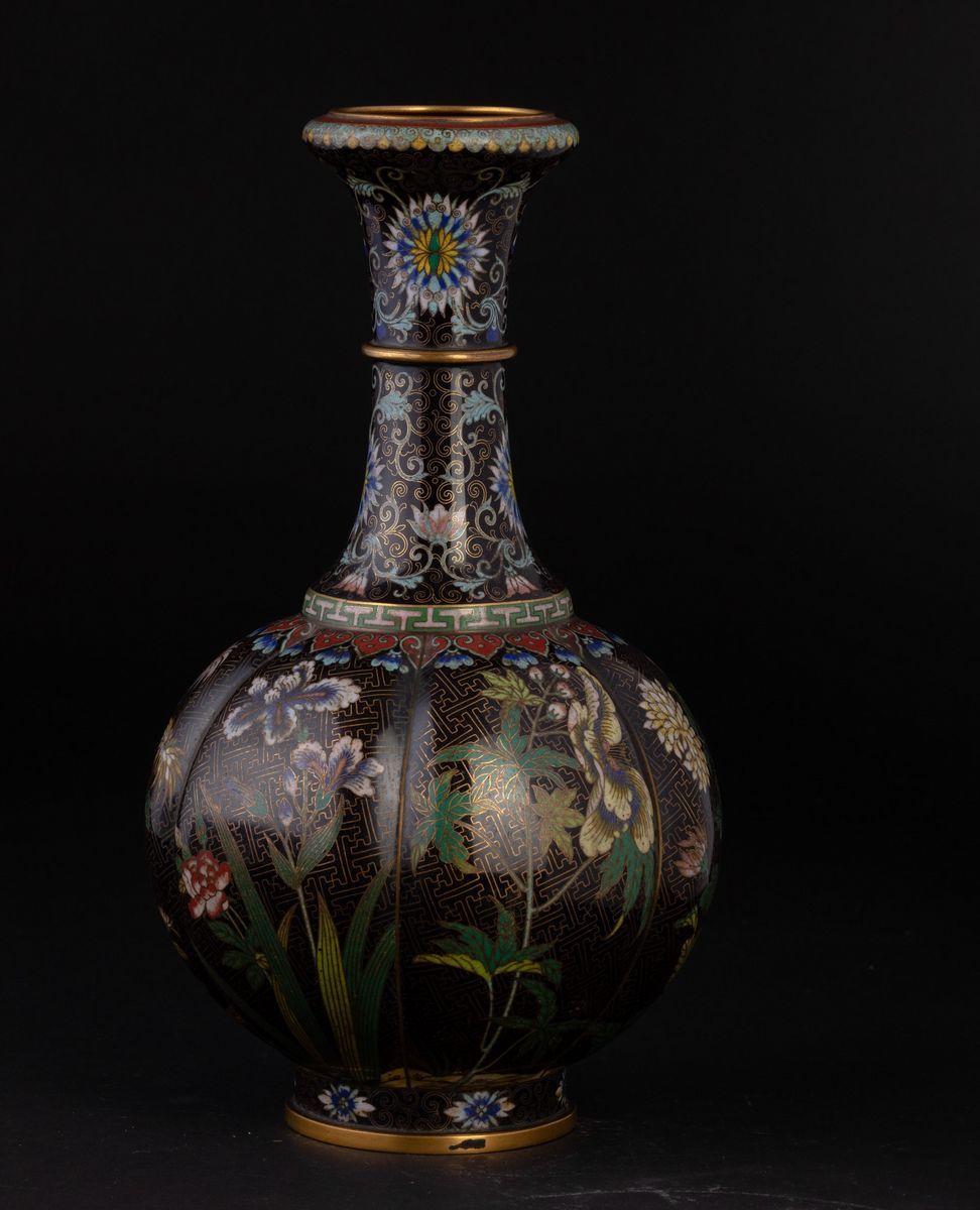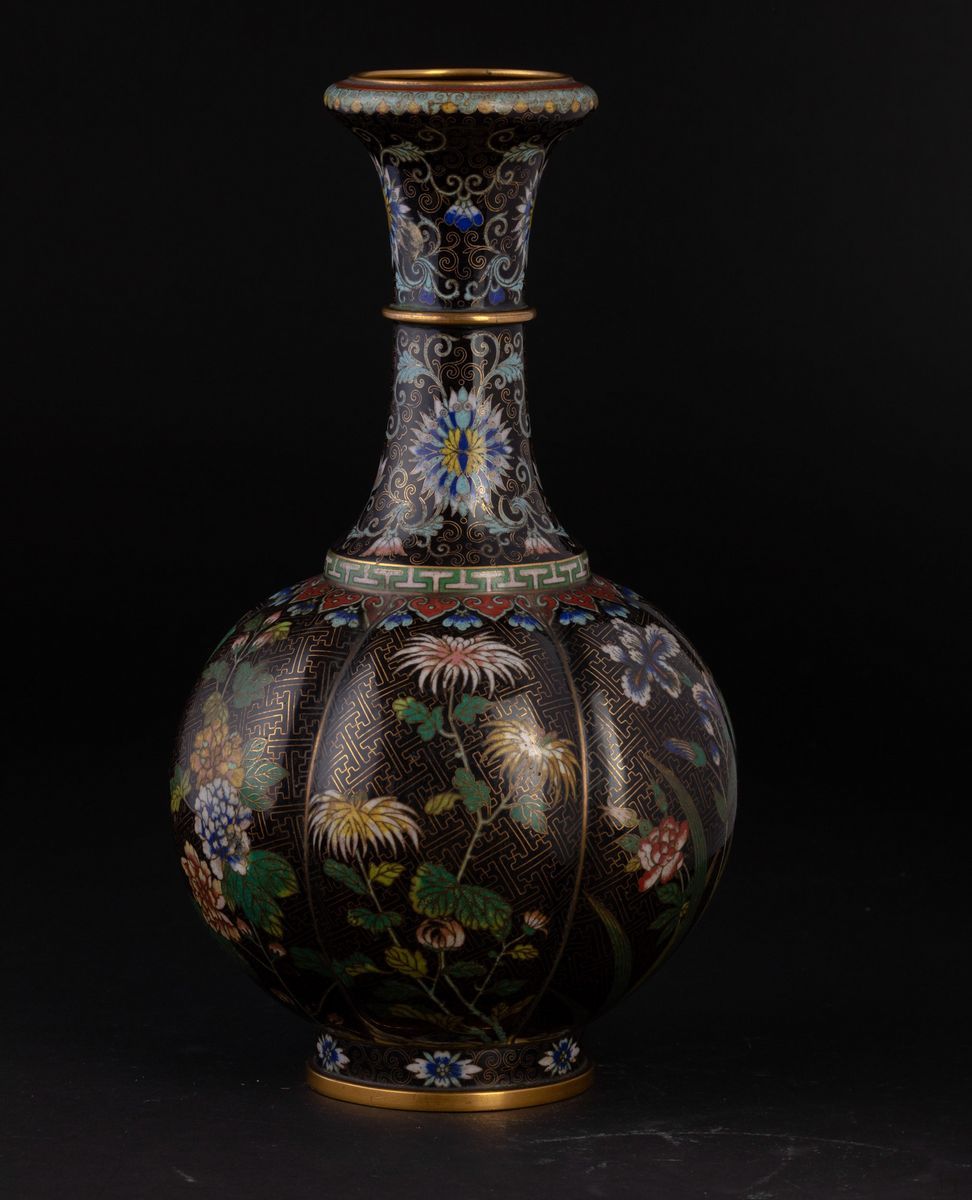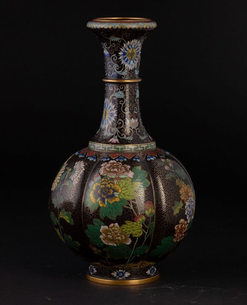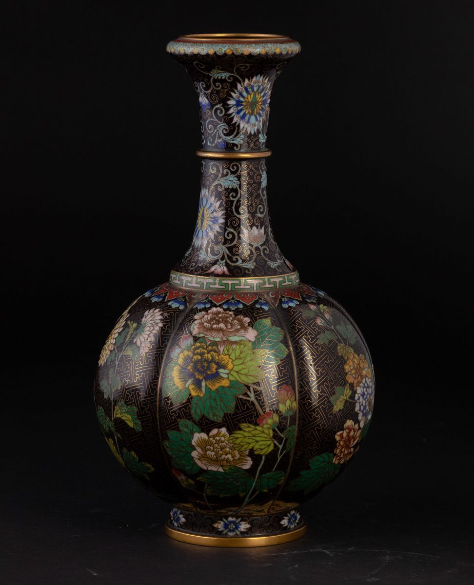 Vaso a bottiglia in smalto con corpo baccellato e decori floreali su fondo nero, Cina, Dinastia Qing, epoca Guangxu (1875 [..]