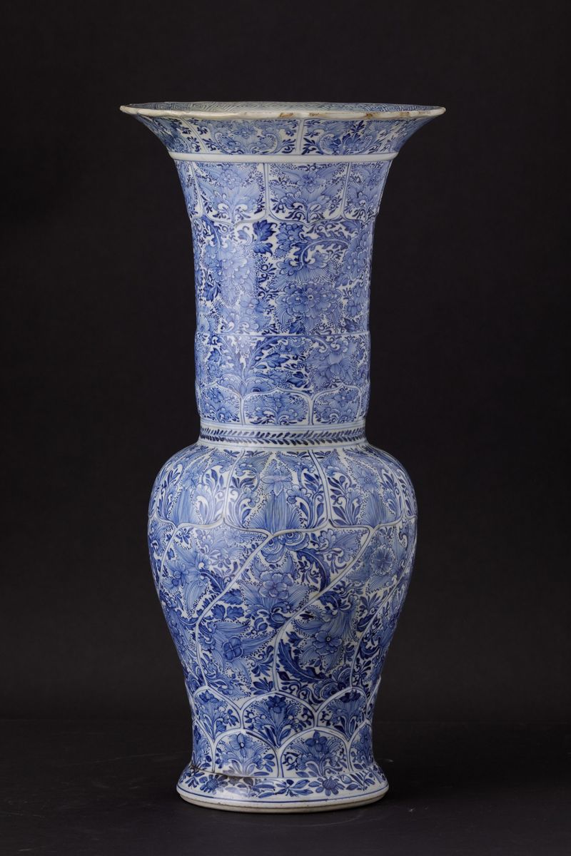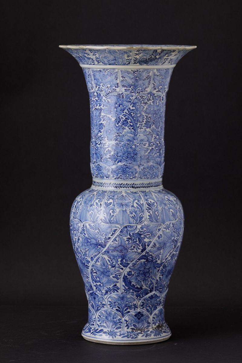 Vaso a tromba in porcellana bianca e blu con decori floreali entro riserve, Cina, Dinasta Qing, epoca Kangxi (1662-1722)