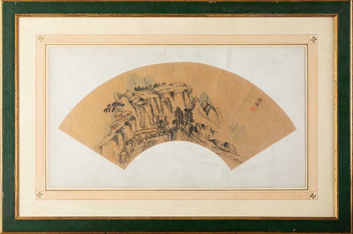 Ventaglio dipinto su carta con paesaggio e iscrizioni, Cina, Dinastia Qing, XIX secolo