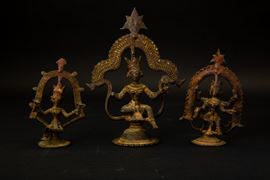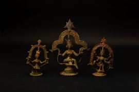 Tre figure in bronzo di divintà assise su piedistalli circolari e sovrastate da archi decorativi con pinnacoli, India, XVIII-XIX secolo