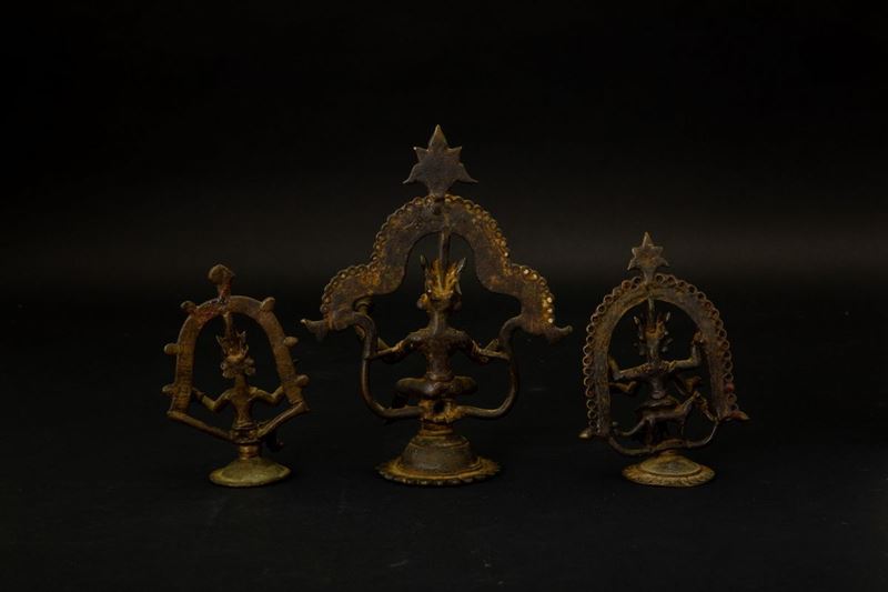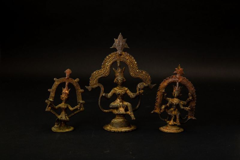 Tre figure in bronzo di divintà assise su piedistalli circolari e sovrastate da archi decorativi con pinnacoli, India, XVIII-XIX [..]