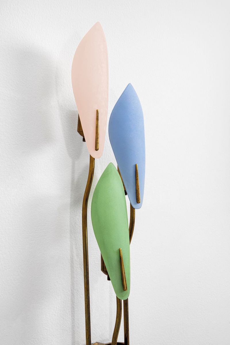 Struttura in ottone ed elementi diffusori in vetro colorato curvato e satinato.