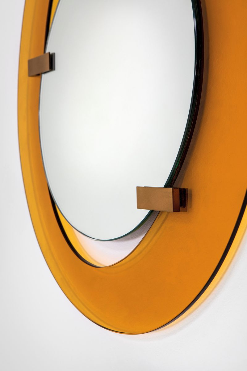 Struttura in legno, montatura in ottone e cornice in cristallo colorato molato.