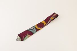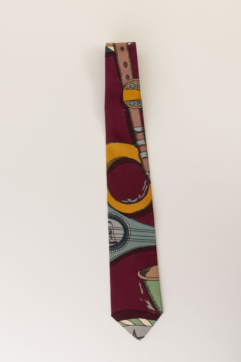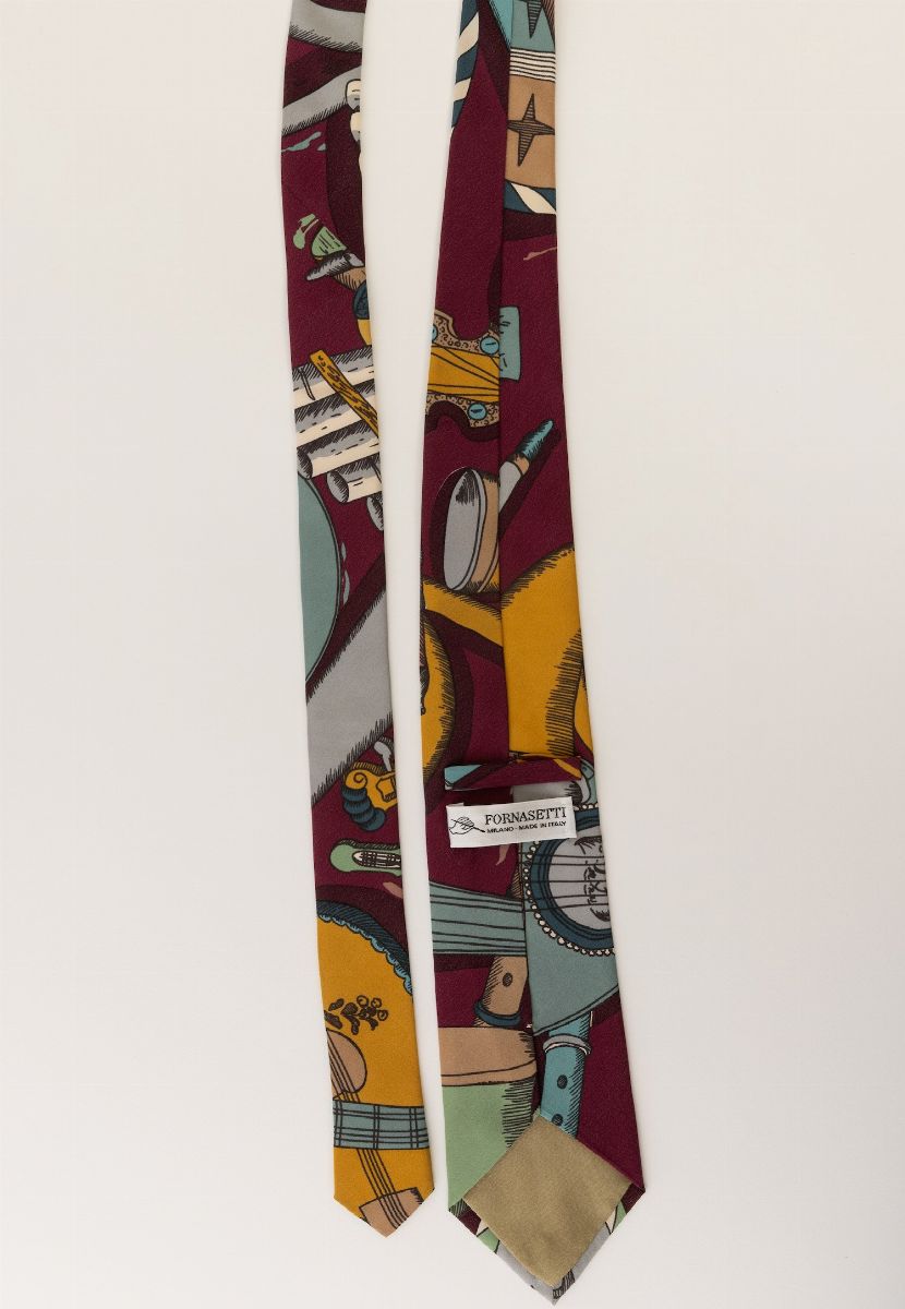 Cravatta in seta con decoro di strumenti musicali su fondo rosso scuro.