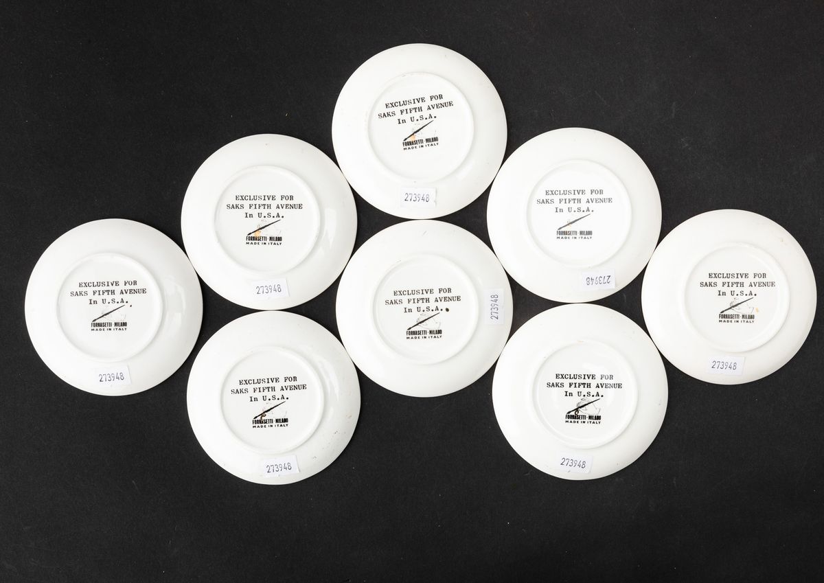 Lotto formato da otto sottobicchieri in terraglia con decoro serigrafato di bighe su fondo oro. Serie realizzata esclusivamente per Saks Fifth Avenue.